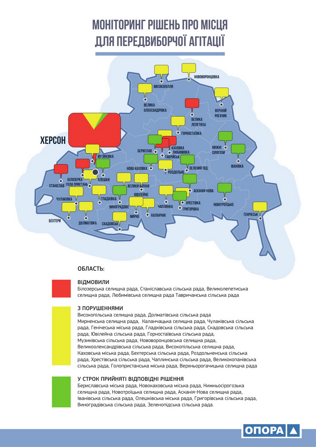 У районах Херсонської області 12 органів влади прийняли рішення про відведення місць для агітації пізніше встановленого законом терміну, 5 рад визначили місця, заборонені законом, 5 рад не прийняли рішення взагалі, а 2 – використовують старий документ 2015 року.