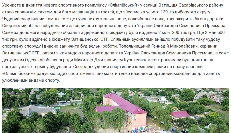 15 липня на офіційному веб-сайті кандидата в народні депутати на окрузі №139 (центр – м. Роздільна) Олександра Пресмана була оприлюднена публікація про урочисте відкриття спортивного комплексу в смт Затишшя Захарівського району. Як зазначено в матеріалі, фінансування робіт здійснювалося за кошти державного бюджету (2,2 млн грн) і бюджету Затишанської ОТГ (2,6 млн грн). В публікації також зазначено наступне: «Спортивний об’єкт побудований за сприяння народного депутата України Олександра Семеновича Пресмана».