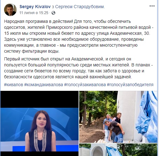 11 липня цей кандидат повідомив на своїй сторінці у Facebook про відкриття 15 липня бювету по вул. Академічна, 30. Про цю подію інформують як про «народну програму в дії». Водночас, згідно з даними платформи ProZorro, замовником робіт з оснащення та благоустрою бювету є державний навчальний заклад Національний університет «Одеська юридична академія» на суму 1 млн 302, 8 тис. грн.