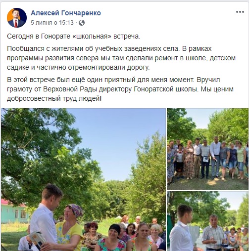 5 липня на сторінці Олексія Гончаренка у Facebook була оприлюднена публікація про його зустріч із виборцями в селі Гонората Подільського району. В ній зазначено, що в рамках програми Олексія Гончаренка розвитку Півночі Одеської області в селі Гонората було відремонтовано школу, дитячий садок та частково дорогу.
