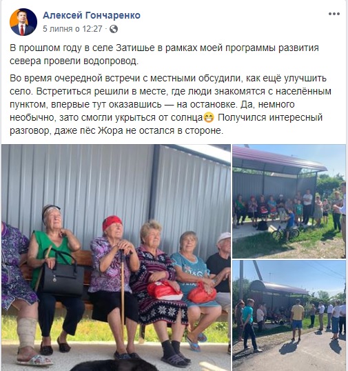 5 липня на його сторінці у Facebook оприлюднено пост про його зустріч з виборцями в селищі Затишшя. В публікації зазначено, що в рамках програми Олексія Гончаренка розвитку Півночі Одеської області в селі Затишшя провели водогін. Втім, згідно з даними про виконання обласного бюджету Одеської області за 2018 рік, на капітальний ремонт водогону в селищі Затишшя були виділені кошти в розмірі 890,5 тис. грн та на капітальний ремонт свердловини – 599,7 тис. грн.