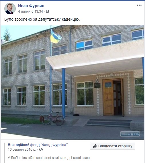 4 липня на його ж сторінці у Facebook був оприлюднений перепост публікації «Фонду Фурсіна» від 16 серпня 2016 року з підписом «Було зроблено за депутатську каденцію». В публікації зазначено, що завдяки Івану Фурсіну з державного бюджету були виділені кошти в розмірі 800 тис. грн на заміну вікон у Любашівській школі-ліцеї.