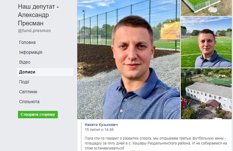Цього ж дня на сторінці у Facebook «Наш депутат - Александр Пресман» було оприлюднено перепост публікації помічника народного депутата Олександра Пресмана Микити Кузькевича з наступним текстом: «…ми відкриваємо третій футбольний міні-майданчик за п'ять днів в с. Кошари Роздільнянського району». Згідно з інформацією про субвенції на соціально-економічний розвиток, з державного бюджету на 2018 рік були передбачені кошти на капітальний ремонт спортивного майданчику зі штучним покриттям для міні-футболу Кошарської загальноосвітньої школи I - III ст. на суму 1,406 млн грн.
