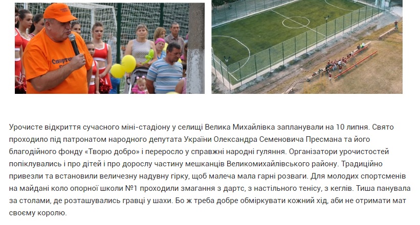 13 липня на офіційному веб-сайті цього ж кандидата оприлюднили інформацію про урочисте відкриття міні-стадіону в смт Велика Михайлівка. Олександр Пресман взяв участь у перерізанні стрічки, а у своєму виступі заявив, що відкриття міні-стадіону є спільною перемогою. Згідно з інформацією про субвенції на соціально-економічний розвиток, з державного бюджету на 2018 рік були передбачені кошти на капітальний ремонт спортивного майданчику зі штучним покриттям для міні-футболу Великомихайлівської опорної загальноосвітньої школи I - III ст. на суму 1,406 млн грн.