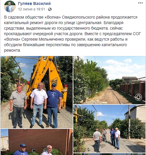 12 липня на сторінці кандидата в народні депутати Василя Гуляєва у соціальній мережі Facebook було оприлюднено публікацію про те, що він проінспектував хід ремонтних робіт дорожнього покриття по вулиці Центральній садівничого об'єднання «Волна» Овідіопольського району. Як зазначено в публікації, кошти на ремонт дороги були виділені з державного бюджету. Згідно з інформаціє про субвенції на соціально-економічний розвиток, з державного бюджету на 2018 рік були передбачені кошти на капітальний ремонт дорожнього покриття від лінії 14 до лінії 23 садівничого об'єднання громадян «Волна» у селі Молодіжне на суму 500 тис. грн, від лінії 22 до лінії 26 – 500 тис. грн, від лінії 25 до автодороги Одеса – Білгород-Дністровський - 500 тис. грн.