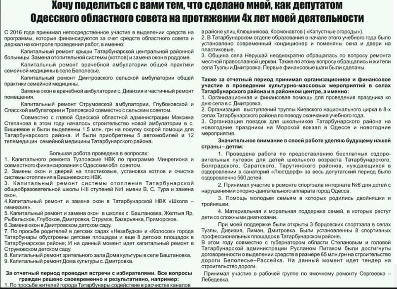 15 липня на сторінці у Facebook кандидата в народні депутати Трифона Антова була оприлюднена публікація про те, що він з 2016 року брав безпосередню участь у виділенні коштів з обласного бюджету на капітальний ремонт даху в Татарбунарської районної лікарні, заміну котлів та вікон у пологовому будинку, капітальний ремонт амбулаторій в селах Білолісся, Дмитрівка, Дивізія, Струмок, Глибоке, Спаське, Трапівка, на будівництво амбулаторії в селі Вишневе Татарбунарського району, закупівлі машини швидкої допомоги для Татарбунарської районної лікарні.