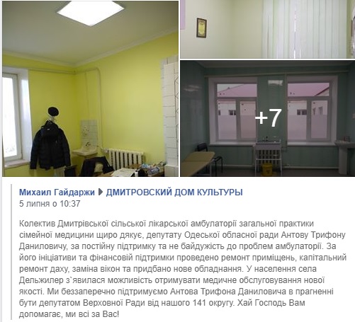 5 липня на сторінці Трифона Антова у Facebook з’явилася публікація, в якій працівники Дмитрівської сільської амбулаторії дякували йому за проведений ремонт в амбулаторії. Згідно з даними звіту Одеської обласної державної адміністрації про виконання обласного бюджету Одеської області за 2018 рік, на капітальний ремонт Дмитрівської сільської амбулаторії загальної практики сімейної медицини Татарбунарського району були виділені кошти в розмірі 308,2 тис. грн.