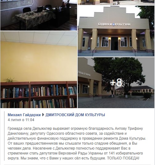 4 липня на його сторінці у Facebook опубліковано пост, що мешканці села Дельжилер дякують йому за ремонт будинку культури. Відповідно до даних ОДА, на капітальний ремонт будинку культури були виділені кошти з обласного бюджету в розмірі 1 млн 4,4 тис. грн.