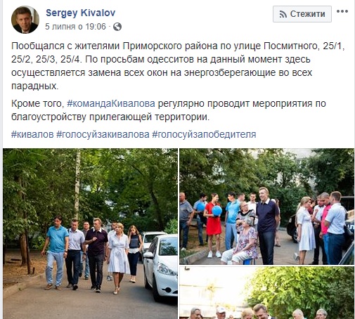 5 липня кандидат у народні депутати Сергій Ківалов повідомив на своїй сторінці у Facebook, що у будинках по вулиці Посмітного №№ 25/1, 25/2, 25/3, 25/4 замінено вікна у під’їздах на енергозберігаючі. Водночас заміна віконних блоків у житлових будинках за цими адресами була передбачена бюджетом розвитку Одеси (рішення міської ради від 12. 12. 2018 р. № 3991-VII «Про бюджет міста Одеси на 2019 рік»; додаток 6 «Розподіл коштів бюджету розвитку за об'єктами у 2019 році»). На роботи виділено 670 тисяч гривень, розпорядником коштів виступав департамент міського господарства.