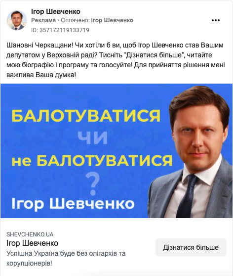 Лідер партії “Успішна Україна” Ігор Шевченко у другій половині липня відзначився тільки фейсбук-постом таргетованим на Черкащину, у якому пропонує відповісти на питання чи варто йому балотуватися від 197 ОВО. В газеті “Канівчанка” №29 від 21 липня розміщена агітаційна стаття про політика та його наміри.