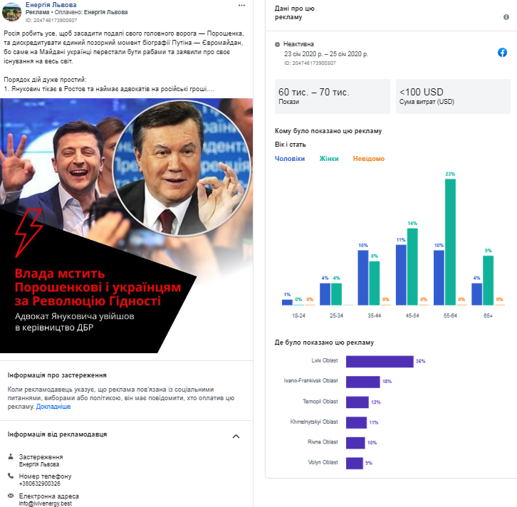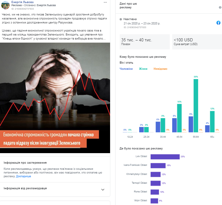 Замикає п'ятірку лідерів за розміром витрат на політичну рекламу сторінка Енергія Львова (створена теж 6 липня 2019, як і сторінка-лідер тижня Стоп капітуляції України). П’ять рекламних дописів коштували замовникам 525$ більшість з яких були орієнтовані на користувачів, які проживають в західних регіонах України: Львівській, Івано-Франківській, Тернопільській, Хмельницькій, Рівненській та Волинській областях. Найдорожча реклама сторінки, на котрій Порошенко колядує з Малковичем, на яку витратили від 200 до 299$ орієнтувалася на всю Україну, окрім, знову ж таки, Донецької та Луганської областей. Кожне повідомлення містило негативні судження щодо політичних рішень Президента України Володимира Зеленського та його команди, всі вони мають дискредитаційний характер.