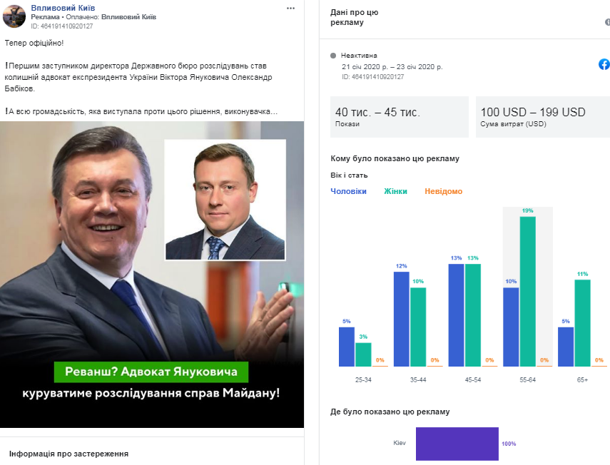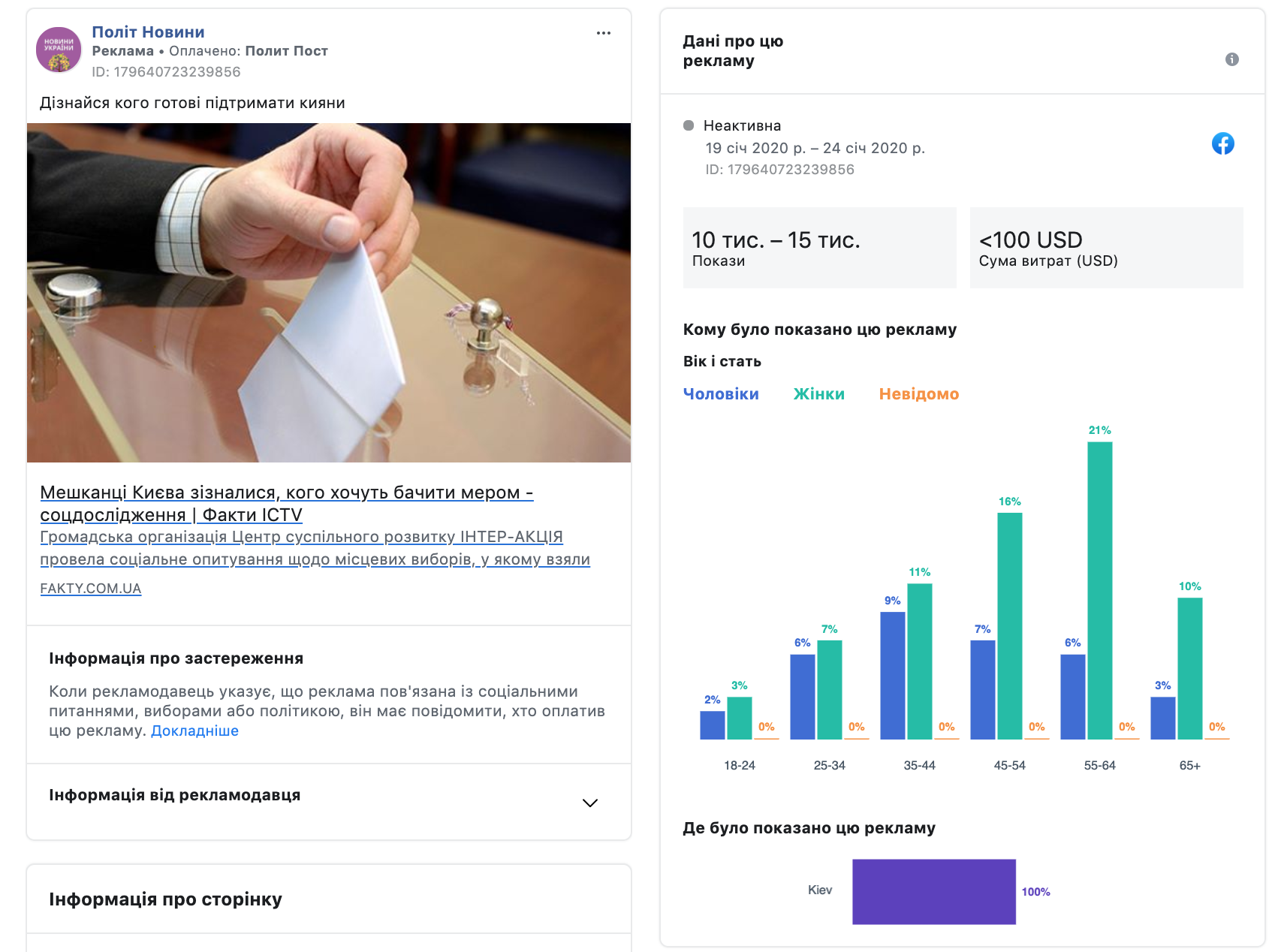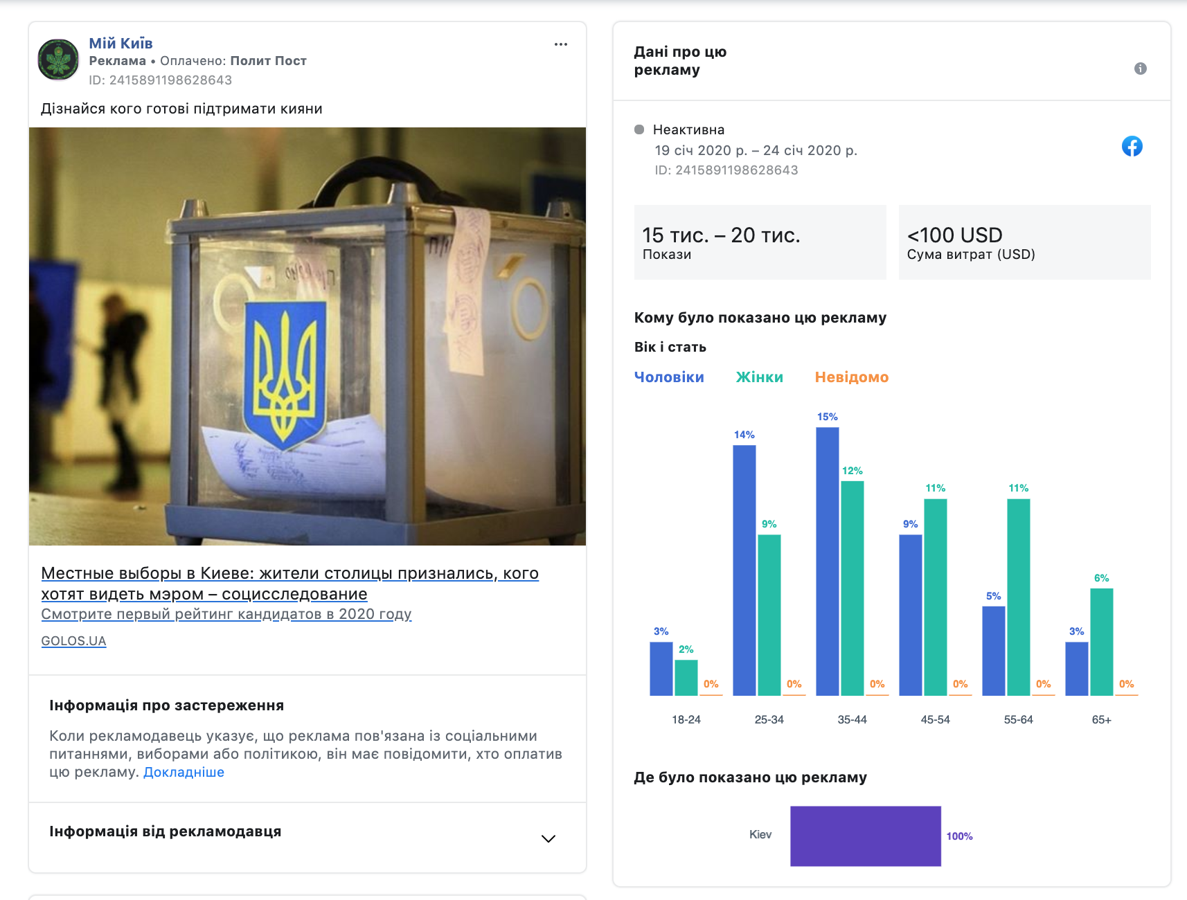 Вимоги Facebook щодо обов'язкової ідентифікації замовників рекламних повідомлень та зазначення дисклеймера, що реклама пов’язана із соціальними питаннями, виборами або політикою, не виконала 91 сторінка. Було запущено 151 політичну рекламу без обов'язкового опису. Тому адміністрація Facebook призупинила транляцію цих повідомлень.