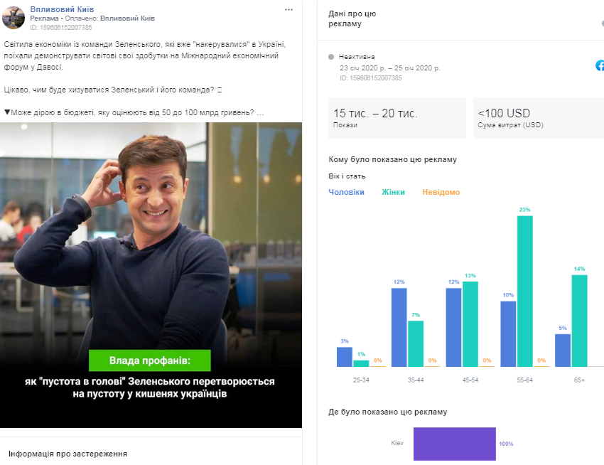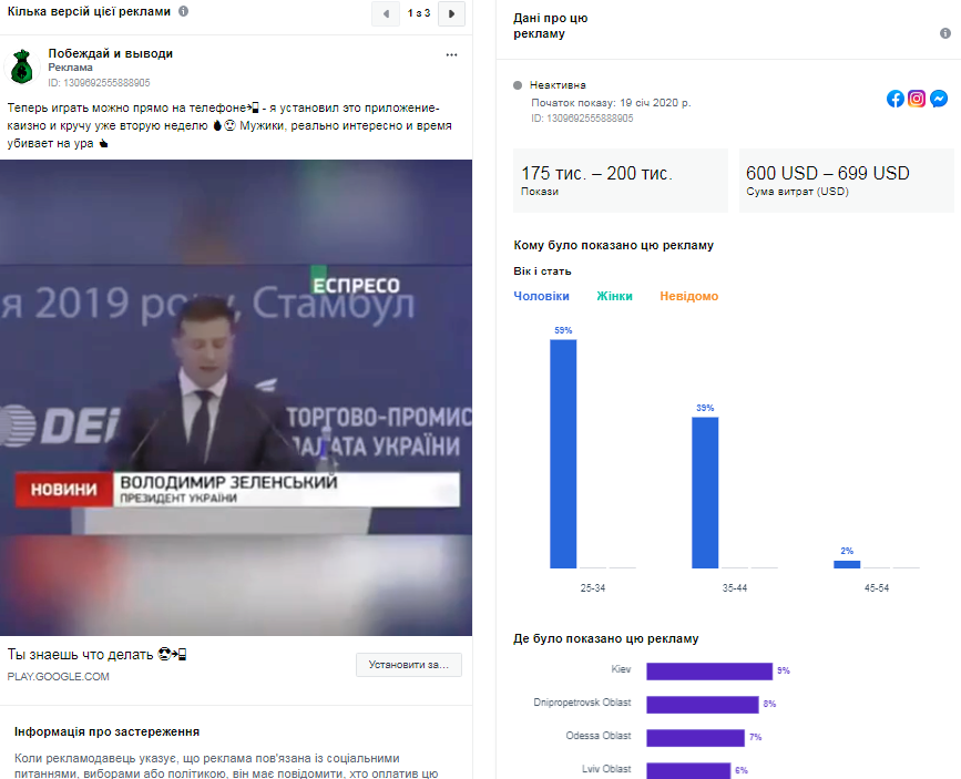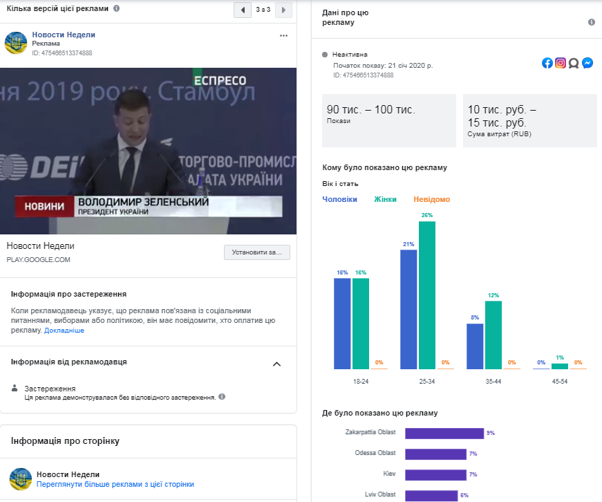 Окрім вищезгаданої сторінки “Побеждай и выводи”, відеоповідомлення, які рекламували онлайн-казино, були опубліковані ще на сторінці Новости недели. Як і сторінка Мультимагнат, про яку ми розповідали у огляді політреклами за попередній тиждень, сторінка Новости недели створена нещодавно (20 січня 2020 року), а вподобав її лише один користувач. Сторінка опублікувала три рекламні оголошення, які були оплачені російськими рублями, загальною вартістю від 15 до 21 тисячі рублів. Це були три однакові відео, які використовували зображення Президента України Володимира Зеленського та нарізки з його інтерв’ю. Це відео демонструвалося 21, 24 і 25 січня без відповідного застереження, його у стрічці побачили від 135 до 155 тисяч користувачів Facebook, Instagram та Messenger. Всі три оголошення були таргетовані на користувачів з усіх регіонів України, як жінок, так і чоловіків.