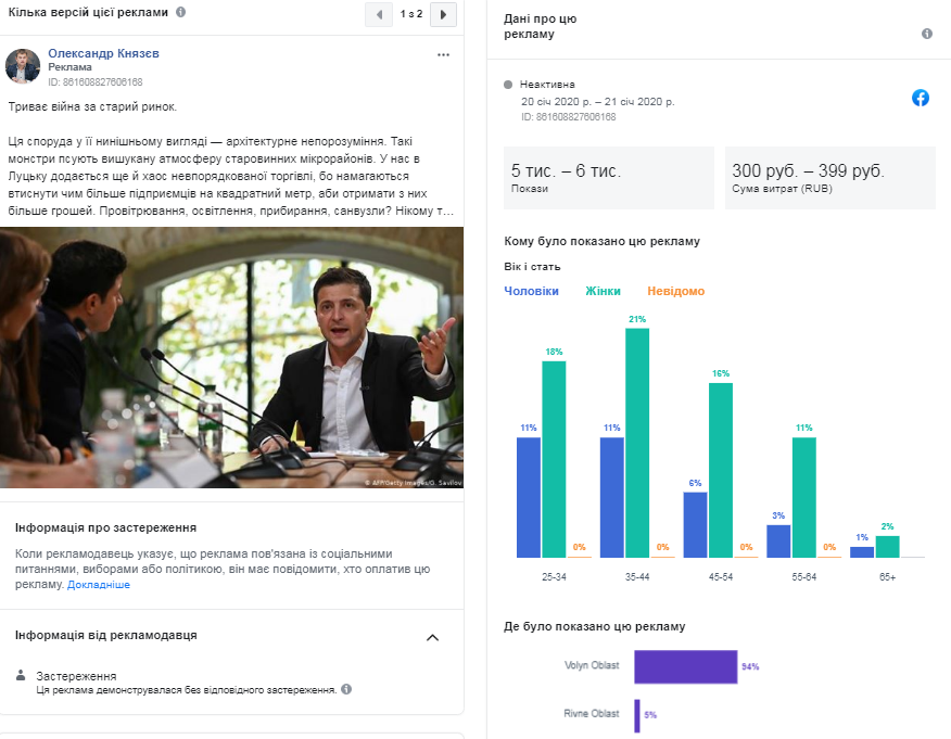 Також російськими рублями за рекламу розрахувався луцький забудовник Олександр Князєв. За два однакових рекламних дописи замовник сплатив від 400 до 600 російських рублів. Втім, цей випадок цікавий більше тим, що демонструє алгоритми роботи Facebook по виявленню політичної реклами. Так, рекламне повідомлення, що стосувалося місцевого старого ринку, ілюструвалося зображенням Президента Володимира Зеленського. Facebook одразу позначив його як політичне і заблокував.