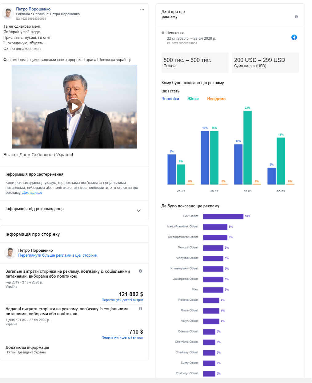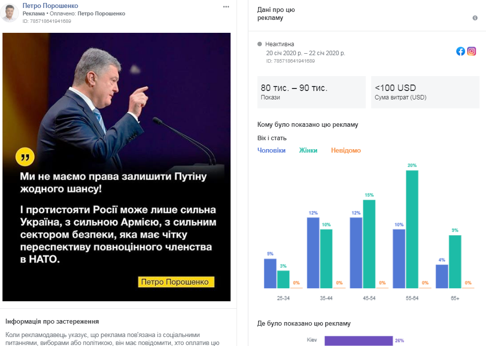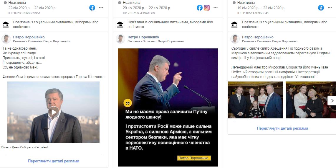 До топ-5 сторінок, які найбільше витратили на політичну рекламу, потрапляє офіційна сторінка Петра Порошенка, де протягом 20 — 26 січня транслювалися вісім рекламних оголошень загальною вартістю 753$. Чотири з них були запущені ще в грудні 2019 року, одне — від початку січня. Ці публікації мають короткий текст-лозунг, покликані залучити нових підписників. Двома повідомленнями Петро Порошенко вітав українців з календарними святами: Хрещенням Господнім та Днем Соборності України. Один допис висвітлює позицію Петра Порошенка щодо української армії, протистояння з Росією та перспективи вступу в НАТО. Привертає увагу, що 27,2% від усіх переглядів політичної реклами Петра Порошенка припало на Львівську область. Жодного разу політична реклама не показувалася користувачам з Донецької та Луганської областей.