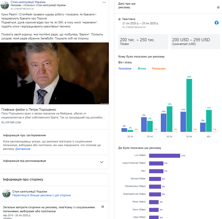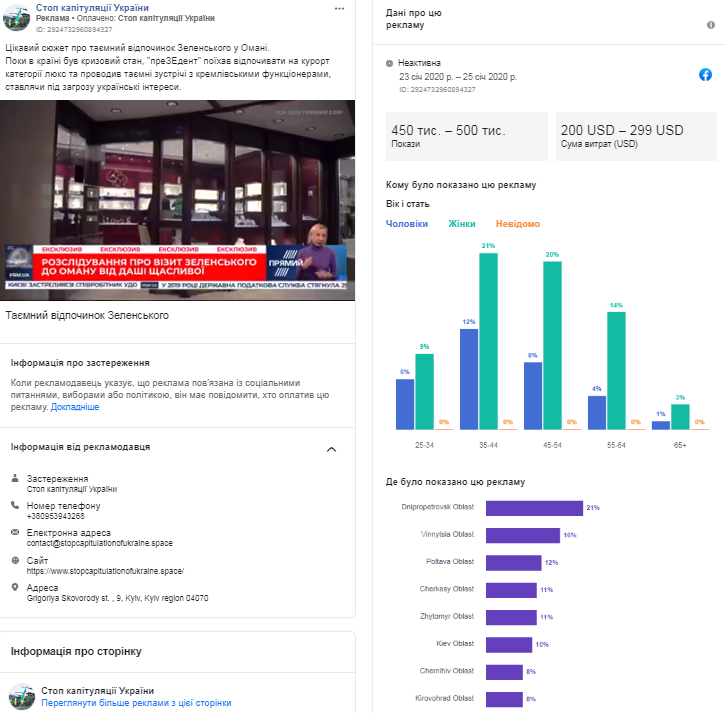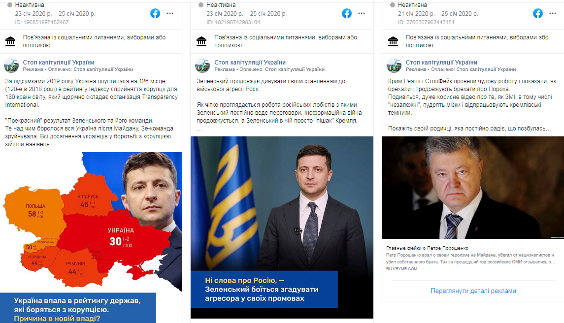 Більше 1000 американських доларів, а саме — 1061$, на рекламу в Facebook витратила сторінка Стоп капітуляції України (створена 6 липня 2019 року). Всього за період з 20 по 26 січня сторінка рекламувала дев'ять повідомлень, які транслювалися 3-5 днів. Вісім дописів стосувалися Президента України Володимира Зеленського, містили критику його політики та порівняння з Петром Порошенком. Більшість з них супроводжувалися візуальним матеріалами із портретом Президента. Два дописи рекламували публікації на сторонніх медіа-ресурсах. Зокрема, російськомовний сюжет програми StopFake News на ресурсі Крым.Реалии з оглядом фейків щодо Петра Порошенка, які були опубліковані у російських ЗМІ протягом минулого року. Другий допис — сюжет телеканалу Прямий про відпочинок Володимира Зеленського в Омані. Ці два повідомлення були найдорожчими серед всіх, опублікованих протягом тижня, і коштували рекламодавцям від 200$ до 299$. Решта дописів, як повідомляє Facebook, мали “чеки” з сумами до 100$. Вісім рекламних повідомлень показувалися користувачам мережі з Дніпропетровської, Вінницької, Полтавської, Черкаської, Київської, Житомирської, Чернігівської та Кіровоградської областей. Лише повідомлення з сюжетом програми StopFake мало більшу аудиторію — охоплювало більшість регіонів України, окрім Донеччини та Луганщини, однак найбільше було зорієнтоване на львів'ян.