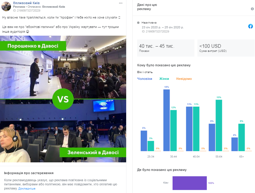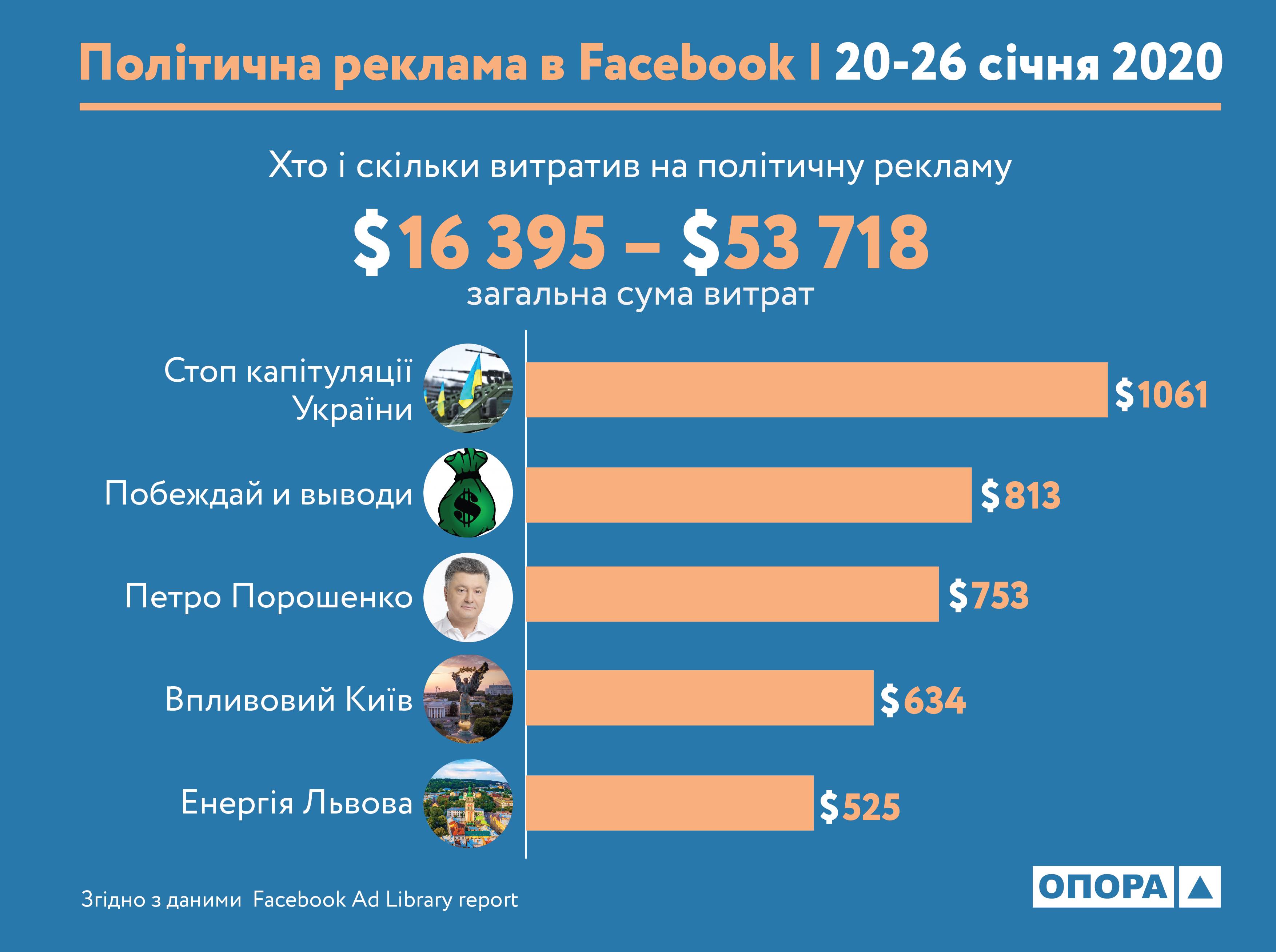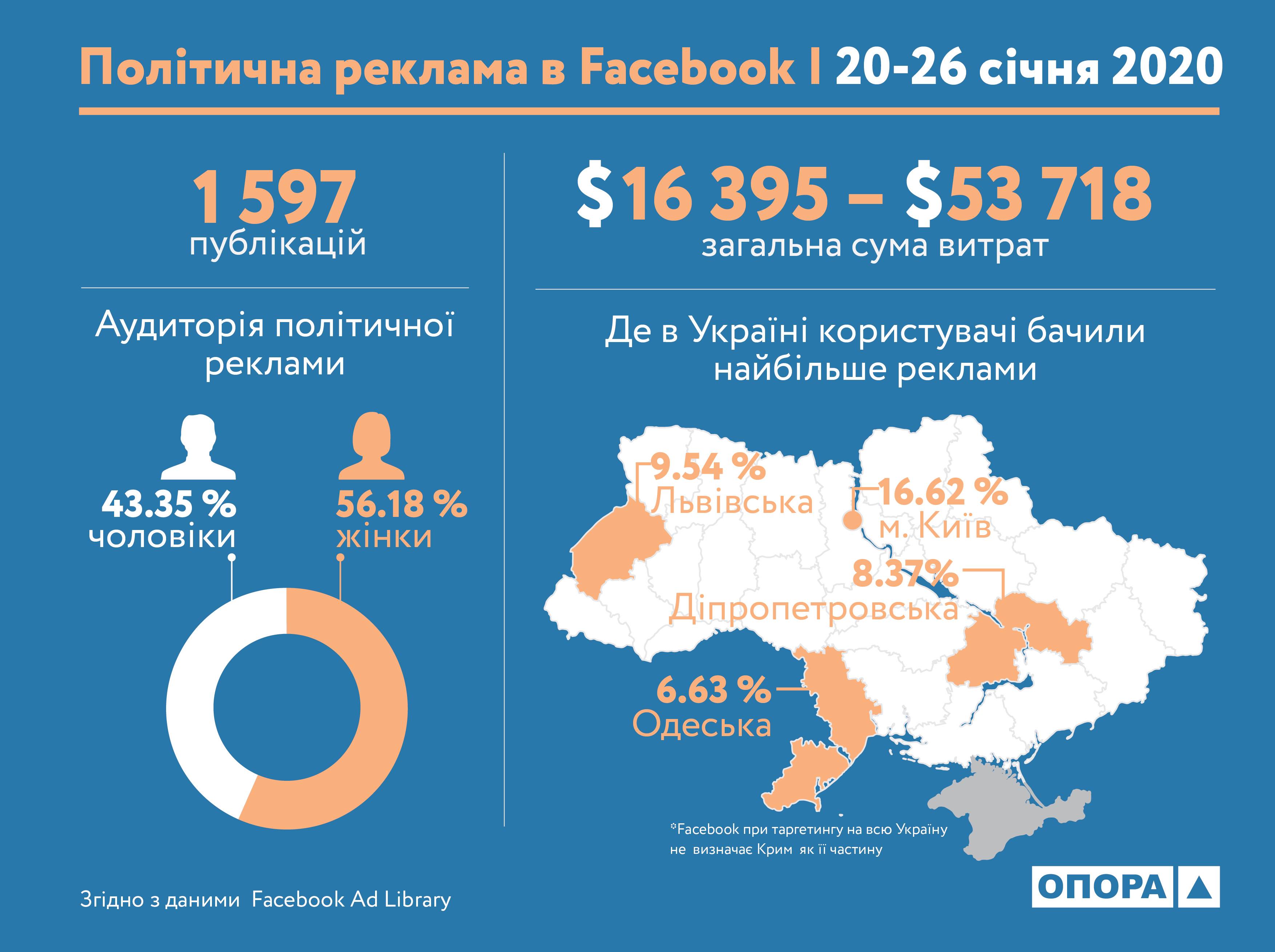 Протягом 20 — 26 січня в Facebook-стрічці українців з’явилося 1597 рекламних повідомлень політичного характеру, які були опубліковані на 437 публічних сторінках. Сумарно на оплату цих дописів замовники витратили від 16 395$ до 53 718$*. 96% рекламних дописів, трансляція яких розпочалася за цей період, коштували менш як 100$. Лише 44 дописи коштували більш як 100$, з них 15 від 200 до 300$.