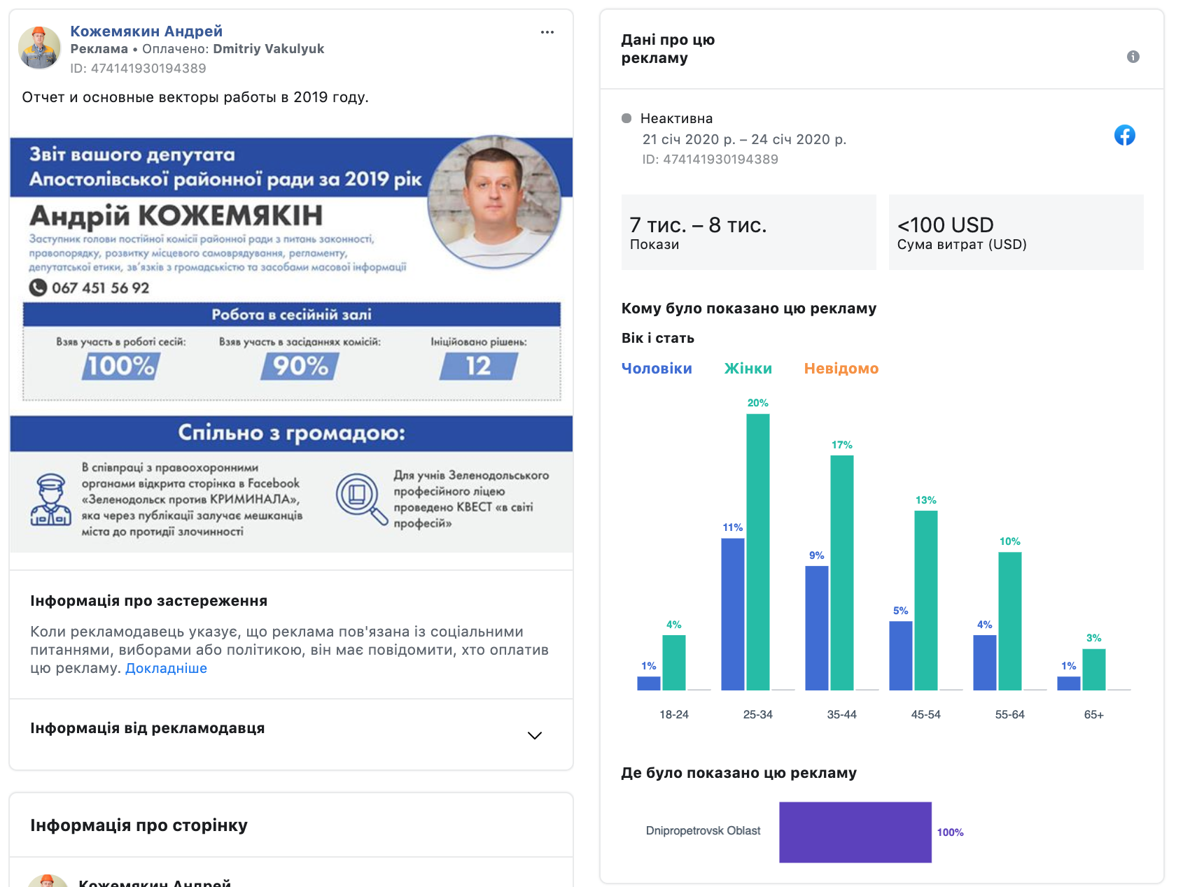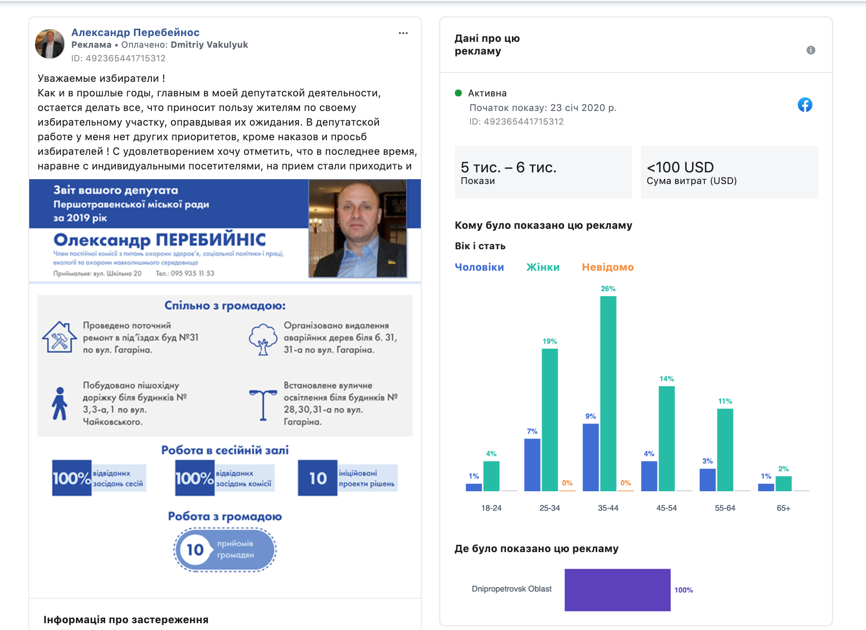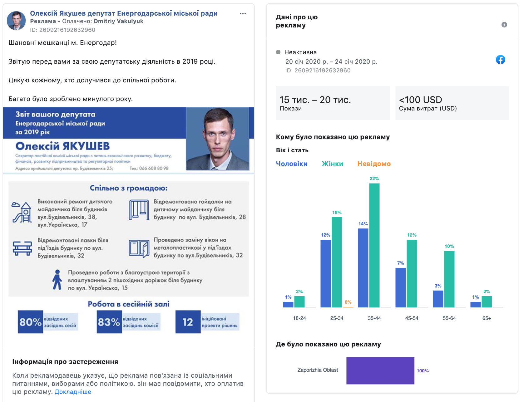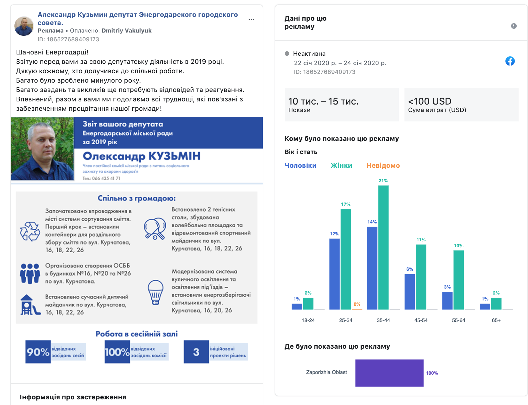 У період з 20 по 26 січня одразу дев’ять депутатів п’яти місцевих рад, обраних від трьох різних політичних сил, прозвітувалися про свою роботу у 2019 році, використовуючи Facebook рекламу. Привертає увагу той факт, що рекламодавцем цих оголошень (11 рекламних дописів) була одна й та сама людина — Dmitriy Vakulyuk (Дмитрій Вакулюк). Як показує пошук Facebook, користувач з таким іменем працює в ДТЕК — DTEK менеджером з діджитал комунікації.