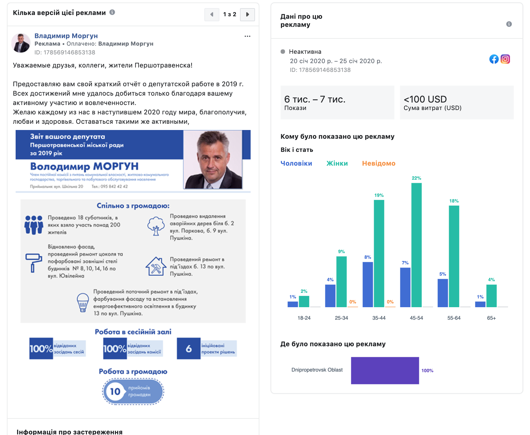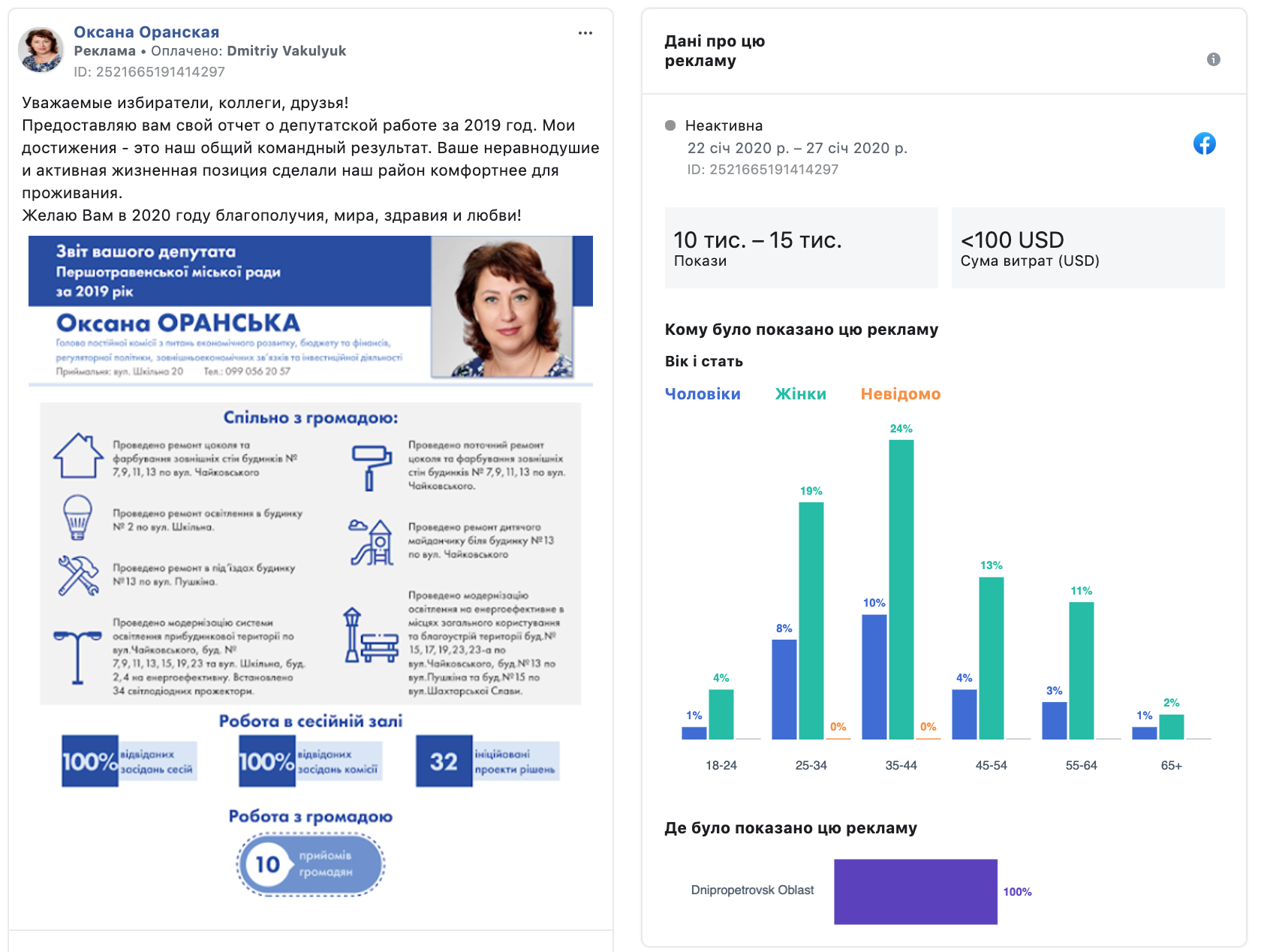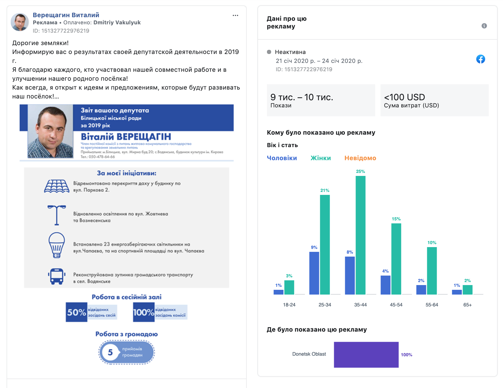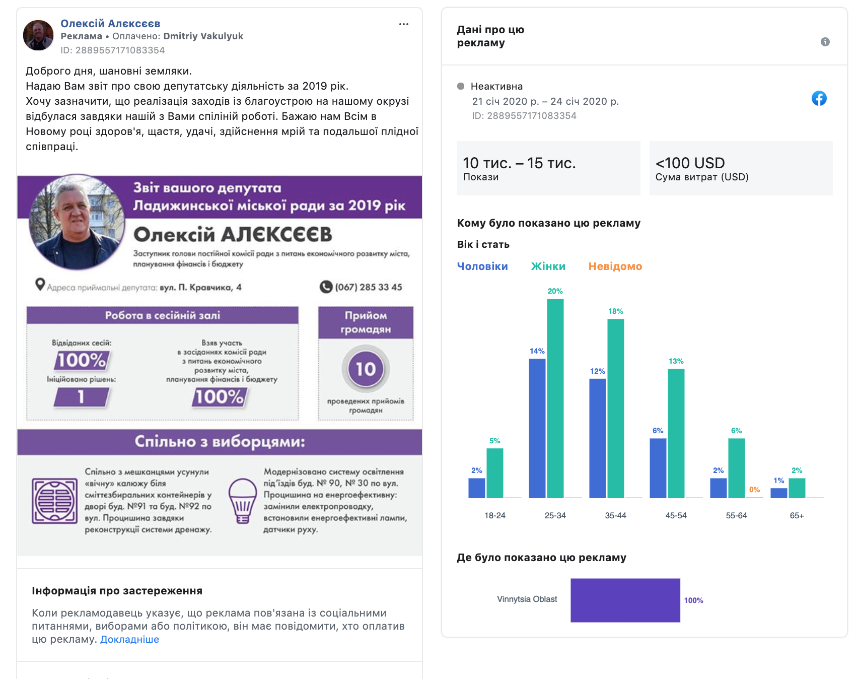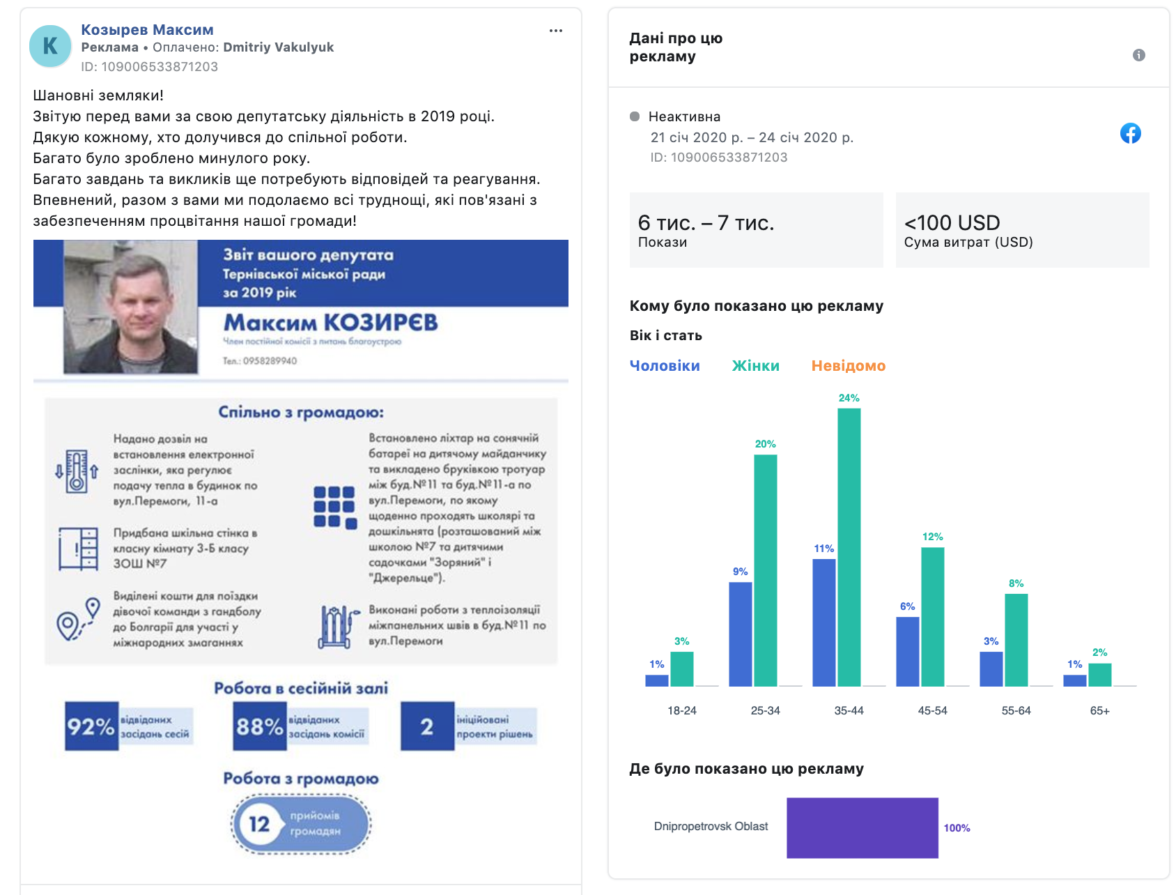У період з 20 по 26 січня одразу дев’ять депутатів п’яти місцевих рад, обраних від трьох різних політичних сил, прозвітувалися про свою роботу у 2019 році, використовуючи Facebook рекламу. Привертає увагу той факт, що рекламодавцем цих оголошень (11 рекламних дописів) була одна й та сама людина — Dmitriy Vakulyuk (Дмитрій Вакулюк). Як показує пошук Facebook, користувач з таким іменем працює в ДТЕК — DTEK менеджером з діджитал комунікації.