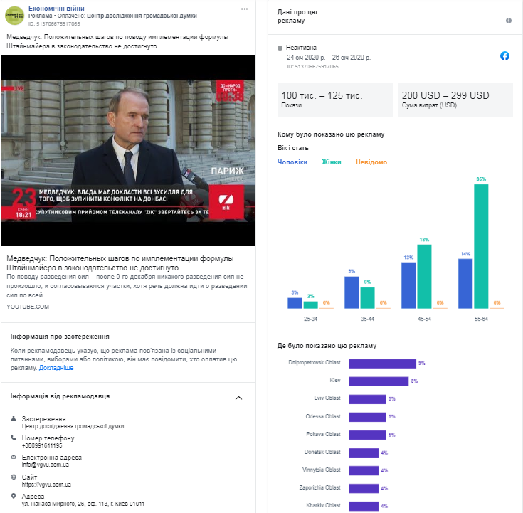 Згідно з даними звіту Бібліотеки політичної реклами Facebook, на кількох сторінках замовником реклами політичного характеру виступала одна організація — Центр дослідження громадської думки. В інформації, яку навів рекламодавець вказано, що організація має сайт — vgvu.com.ua (при спробі відвідати цей сайт Google повідомляє про помилку встановлення з'єднання з базою даних), розташована за адресою вул. Панаса Мирного, 26, м. Київ 01011 (цей пункт заповнений російською мовою), як контактний зазначено номер +380991611195. Так, Центр розмістив рекламу на трьох Facebook-сторінках: Все гарно в Україні (створена 17 грудня 2018 року), Вільний Донбас (створена 19 лютого 2019 року) та Економічні війни (створена 5 червня 2019 року). Всі рекламні дописи на цих сторінках, а також на сторінці Політичні війни (створена 16 листопада 2018 року) поширюють відеозаписи виступів та коментарів для ЗМІ Віктора Медведчука. За тиждень вони витратили 1186$ на публікацію восьми оголошень.
