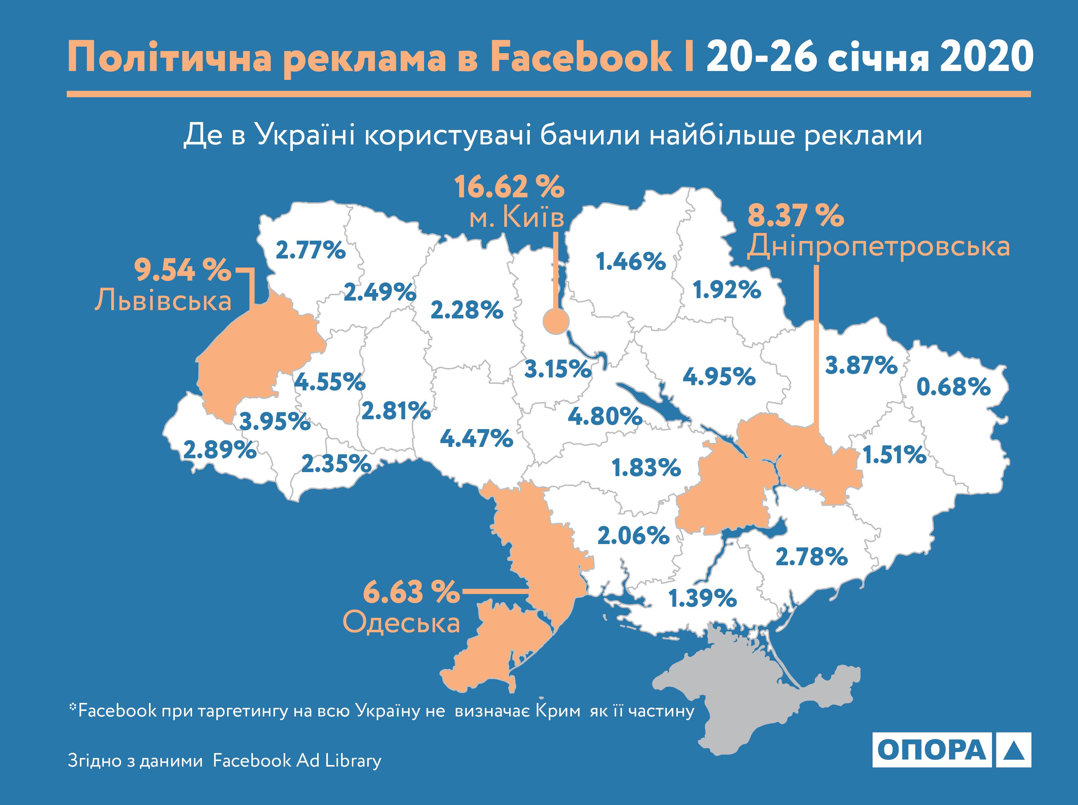 Частина реклами була спрямована на жителів всієї України, частина налаштована на користувачів соціальних мереж у конкретних регіонах. Цього тижня найчастіше оплачені дописи бачили кияни — 16,62% від усіх переглядів, жителі Львівської — 9,54%, Дніпропетровської — 8,37% та Одеської — 6,63% областей.