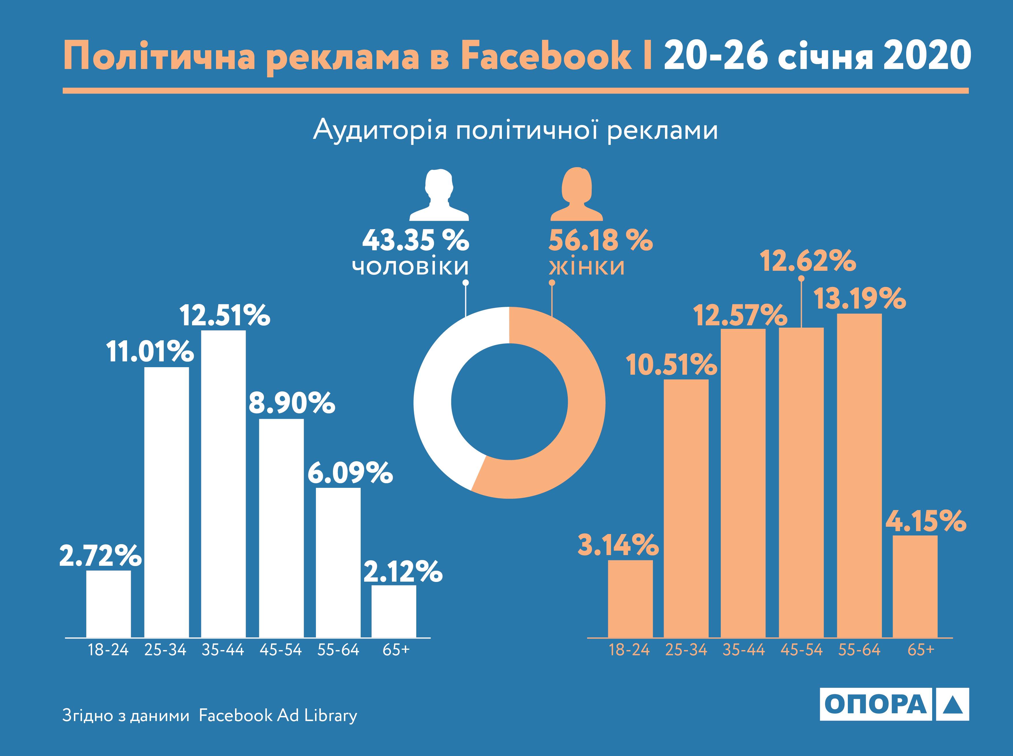 Донести інформацію з рекламних повідомлень замовники прагнули переважно до жіночої аудиторії користувачів Facebook та Instagram. Тож за тиждень з 20 по 26 січня найбільше її переглянули жінки (56,18%). Чоловіча аудиторія рекламних повідомлень склала 43,35%.