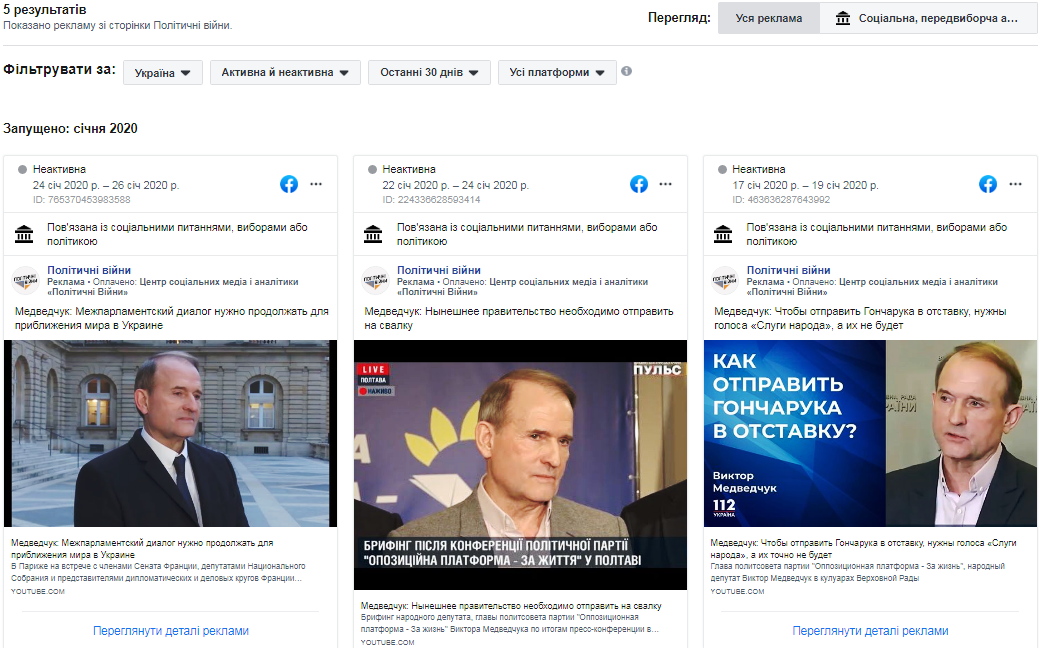 Позицію Віктора Медведчука рекламувала мережа сторінок, а платив один Центр