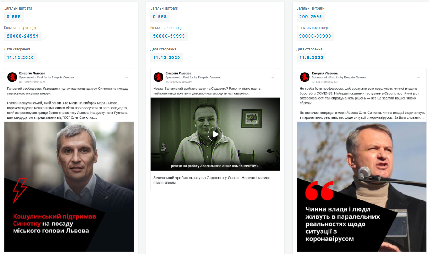 «Енергії Львова» це сторінка, яка переважно публікує новин України та Львівської області, проте робить це тенденційно та у власній інтерпретації. Аналіз контенту показав, що це повідомлення патріотичного характеру, засудження російської агресії, політики Росії та діяльності «Опозиційної платформи – За життя», критика центральної влади України, діючого президента Володимира Зеленського та його партії «Слуга народу», а також підтримка п’ятого президента Петра Порошенка та його партії «Європейська Солідарність». Повідомлення про Олега Синютку на цій сторінці були лише комплементарними, тоді як про Андрія Садового – критичні або дискредитаційні. У період з 1 серпня по 24 листопада нам вдалося віднайти на ній щонайменше 5 повідомлень про Садового, котрі можна віднести до технології «чорного піару» і жодного аналогічного поста про Синютку. Вони появилися після дня голосування у кінці жовтня і активно поширювалися у період між двома турами голосування.
