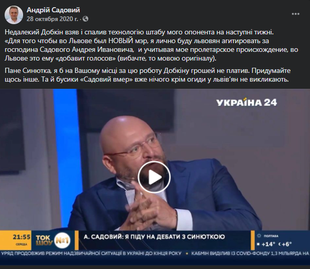 У день тиші, 24 жовтня, на сторінці було оприлюднено відео «Думки моральних авторитетів» з нарізкою фрагментів із прес-конференції, яку провів 16 жовтня у Львові Юрій Луценко спільно з першим номером списку партії «Європейська Солідарність» до Львівської обласної ради Іриною Гримак (тепер обіймає посаду голови ради). Про неї на своїй сторінці цього ж дня опублікував два повідомлення Олег Синютка: у першому він виклав аргументи колишнього генерального прокурора про те, чому він просить львів’ян проголосувати «проти» Садового, а в другому – чому він точно проголосував би «за» Синютку, якщо б жив у Львові. У відповідь на це Андрій Садовий не відмовчувався і обізвав Юрія Луценка «банальним фейкометом».