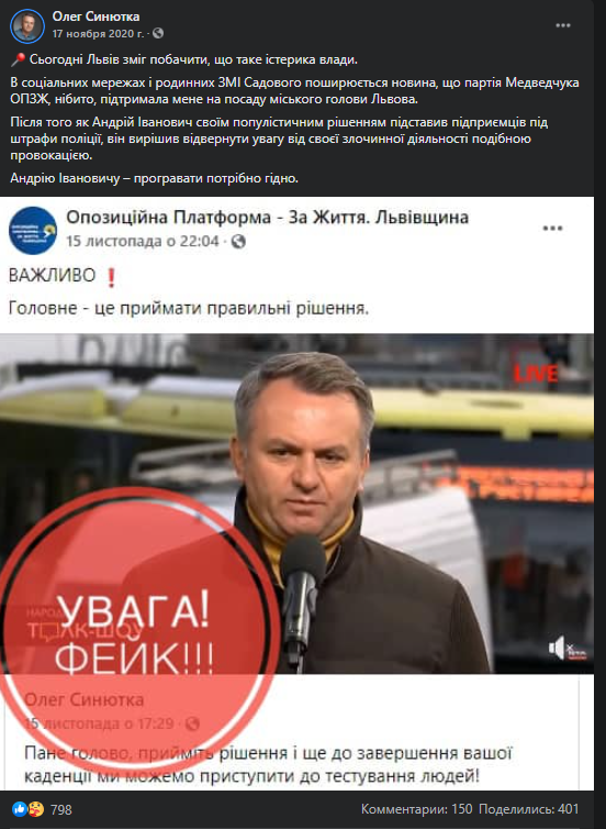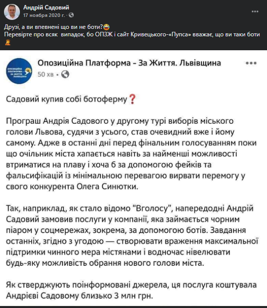Фінальну крапку у цій серії поставила стаття інтернет-видання Zaxid.Net, у якій зазначається, що «львівський осередок партії ОПЗЖ підтримав Олега Синютку». Це не до кінця зрозуміла історія про кілька повідомлень на сторінці партії у Facebook, де поміж двох кандидатів вони надають перевагу меншому злу, яким вважають представника «Європейської Солідарності». Очевидно, що про існування цих постів так ніхто б і не дізнався, якщо б не Zaxid.Net. Повідомлення активно поширювали у соціальній мережі, що дозволило йому отримати близько 2 тис. взаємодій. На нього відреагував Олег Синютка, який назвав це «істерикою влади», яка поширює фейки за допомогою «родинних ЗМІ Садового». «Після того як Андрій Іванович своїм популістичним рішенням підставив підприємців під штрафи поліції, він вирішив відвернути увагу від своєї злочинної діяльності подібною провокацією» - завершив він. Водночас Андрій Садовий спростував звинувачення львівського партійного осередку «Опозиційна платформа - За життя» у використанні ним «послуг у компанії, яка займається чорним піаром у соцмережах, зокрема, за допомогою ботів».