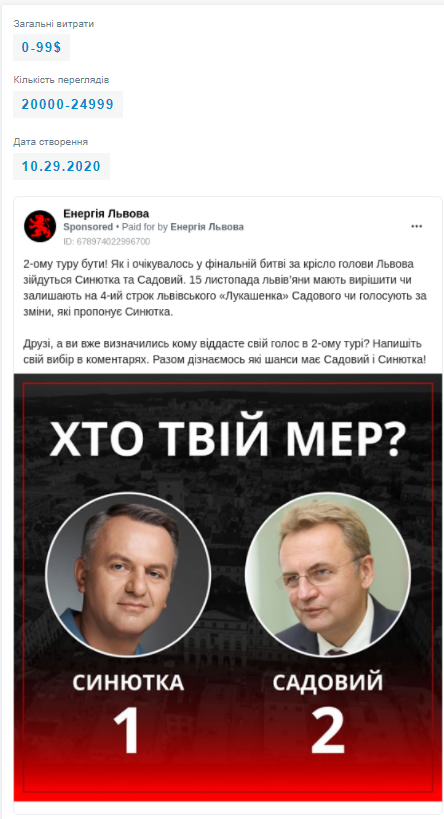 Після оголошення результатів першого туру сторінка запитувалася у користувачів Facebook «Хто твій мер?», назвавши Андрія Садового «львівським» Лукашенком і закликаючи голосувати за зміни, які пропонує Олег Синютка. Також було відео під назвою «Садовий збільшив борги Львова у 8 раз», у якому обігрується проблема кредитних зобов’язань міста, яку ми описали раніше. Чергові відео «Зарплати заступників Садового вражають!» також перегукується із заявами, які в рамках виборчої кампанії робив Олег Синютка про високі зарплати працівників Львівської міської ради. Ще одне відео «Зеленський зробив ставку на Садового у Львові» покликається до ще одного звинувачення в сторону міського голови від його основного конкурента про те, що Андрій Садовий співпрацює з центральною владою. У відео під назвою «Садовий криє матом» мера Львова порівнюють з Генадієм Кернесом та Михайлом Добкіним.