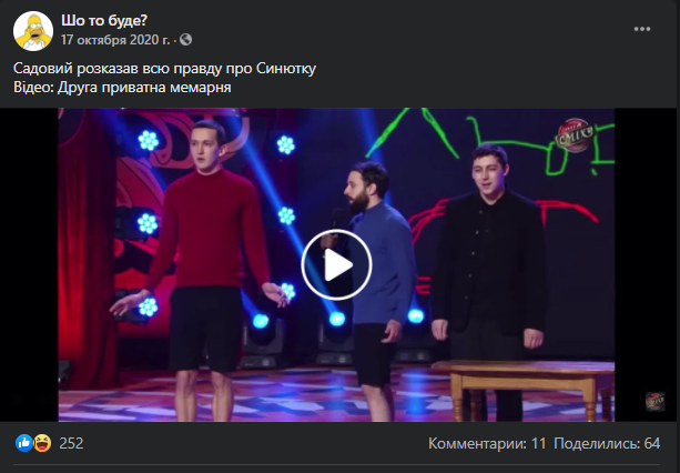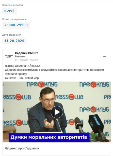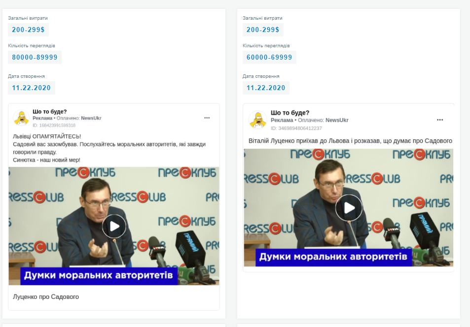 Єдине повідомлення, яке було опубліковано на кожній з цих двох сторінок є відео з нарізкою фрагментів із прес-конференції Юрія Луценка у Львові, яке було проаналізоване вище. Вперше воно було опубліковано 27 жовтня на сторінці «Садовий вМЕР» і сукупно мало 2732 взаємодій (1,5 тис. реакцій та 1,1 тис. коментарів). Другий раз те саме відео було опубліковано 20 листопада на сторінці «Садовий ВМЕР?», за два дні до дня повторного голосування, і цього разу мало лише 82 взаємодії. Перший пост був розміщений як платна політична реклама, тоді як другий - як звичайне повідомлення. А 21 листопада четвертий раз це ж саме відео було оприлюднене на сторінці «Шо то буде?», що ускладнило завдання для встановлення в чиїх інтересах працювали сторінки «Садовий вМЕР» і «Садовий ВМЕР?».