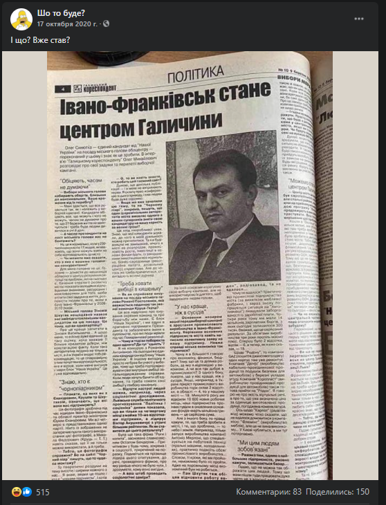 У повідомленні зазначається, що «Коломойський настільки палкий прихильник Андрія Івановича, що під дописом чинного очільника міста одразу двоє одіозних соратників олігарха написали слова підтримки. Цими двома є смотрящий за Прикарпаттям Олександр Шевченко та скандальний екс-нардеп Парасюк». Мова йде про пост Садового від 13 листопада про рішення виконкому Львівської міської ради з відмовою запроваджувати у місті карантин «вихідного дня», під яким написали схвальні відгуки Шевченко та Парасюк. На цьому аргументи даного повідомлення вичерпуються. Про не випадковість підтримки Олександром Шевченком Андрія Садового також свідчить його відеозвернення після теледебатів, у якому він бажає перемоги меру Львова у день повторного голосування 22 листопада. Завершується пост припущенням, що «з такою командою підтримки Садовий скоро і з Медведчуком затоваришує». Такі твердження є частиною наративу опонентів міського голови, які протягом виборчої кампанії намагалися доводити його зв‘язок з непопулярними на Львівщині політиками з метою дискредитації.