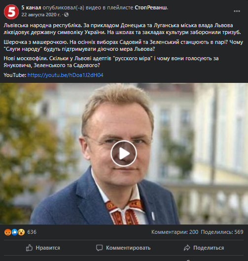 Проте повідомлення дискредитаційного змісту поширювали не лише анонімні сторінки, але також самі кандидати або наближені до них медіа. Наведемо кілька прикладів. Напередодні Дня незалежності, 22 серпня, сторінка телеканалу «5 канал» (відстежує 528 тис. користувачів) запостила на своїй сторінці у Facebook сюжет про «Львівську народну республіку». У ньому розглядається питання інформаційних таблиць на закладах освіти та культури у Львові нового зразка, на яких немає державної символіки України, а лише логотип Львівської міської ради. Цього авторам сюжету було достатньо, щоб порівняти керівництво міста із самопроголошеними Луганською та Донецькою народними республіками. Крім цього вже звично Садового звинувачують у співпраці з президентською партією, яка надавала підтримку його кандидатурі на посаду міського голови. Цей пост поширювали 570 разів, з яких щонайменше 50 разів по львівських суспільно-політичних пабліках, що дозволило йому отримати 1525 взаємодії. Андрій Садовий відреагував на своїй сторінці словами: «Думав вони вже давно досягнули дна, але ж ні, стараються, заглиблюються далі. Це не журналістика. Це «russia today».