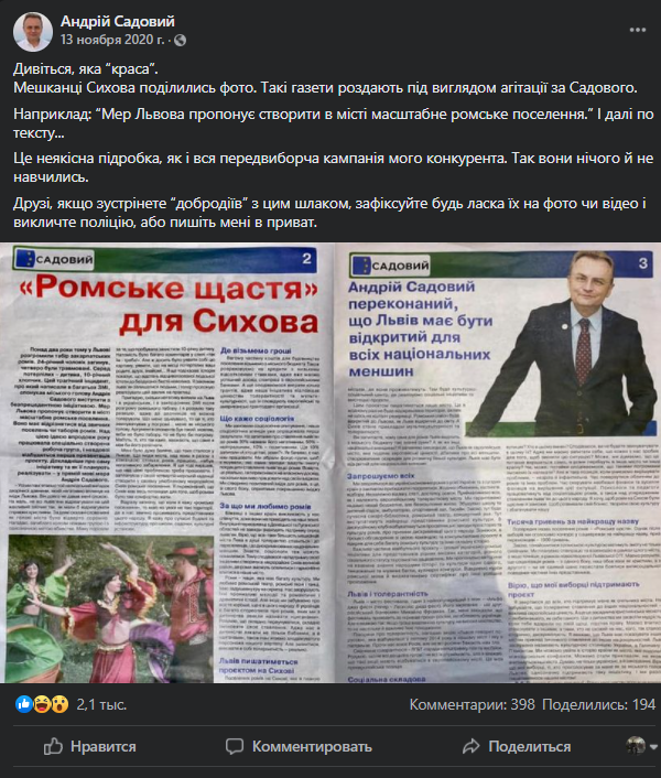 Про ще один випадок використання чорних виборчих технологій усі дізналися завдяки посту Андрія Садового, який 13 листопада опублікував у себе на сторінці. Мова йде про поширення в мікрорайоні Сихів підробленої газети, яка стилістично подібна на газети партії Об’єднання «Самопоміч» під виглядом агітації за міського голову. Згідно з інформацією зі статті інтернет-видання Zaxid.Net їх вкидали у поштові скриньки. Основну увагу привертає стаття «Ромське щастя» для Сихова», у якій стверджується, що мер Львова пропонує створити у місті масштабне ромське поселення. Садовий назвав це «неякісною підробкою, як і вся передвиборча кампанія мого конкурента». Очевидно, маючи на увазі Олега Синютку. Своєю чергою висуванець «Європейської Солідарності» та його соратники назвали це обманом і самопіаром мера у стилі листівок, які поширювалися під час місцевих виборів 2006 року «Буняк негр» (Степан Буняк був міським головою Львова у 2002-2005 рр.). Пост Садового поширили 195 разів, з них щонайменше у 6 групах. Сумарно він отримав 3117 взаємодій. В результаті симпатики Андрія Садового вважають причетним до поширення газети Олега Синютку, тоді як його противники переконані у тому, що це провокація, яку зробила команда міського голови.