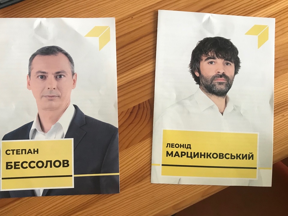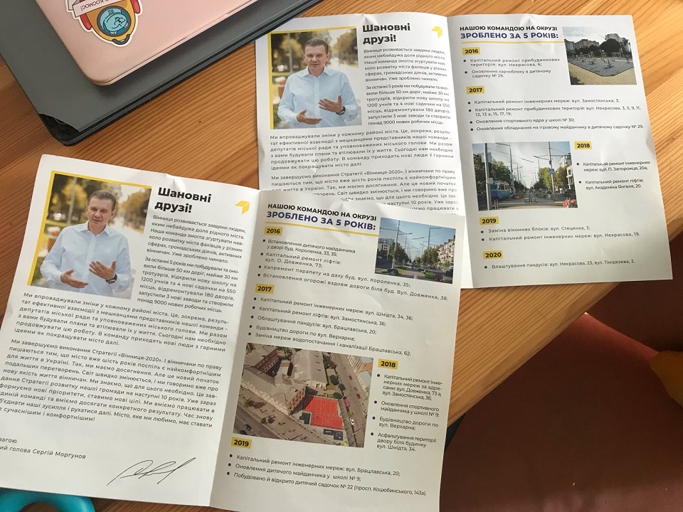 На площі Перемоги біля Будинку офіцерів розповсюджували листівки з фото політиків – Леоніда Марцинковського (балотувався до Верховної ради у 2019 році) та Степана Бессолова (депутат Вінницької міської ради від партії «Вінницька європейська стратегія»). Всередині листівки міститься звернення до вінничан міського голови Сергія Моргунова та короткий звіт про те, що зроблено командою на виборчому окрузі.