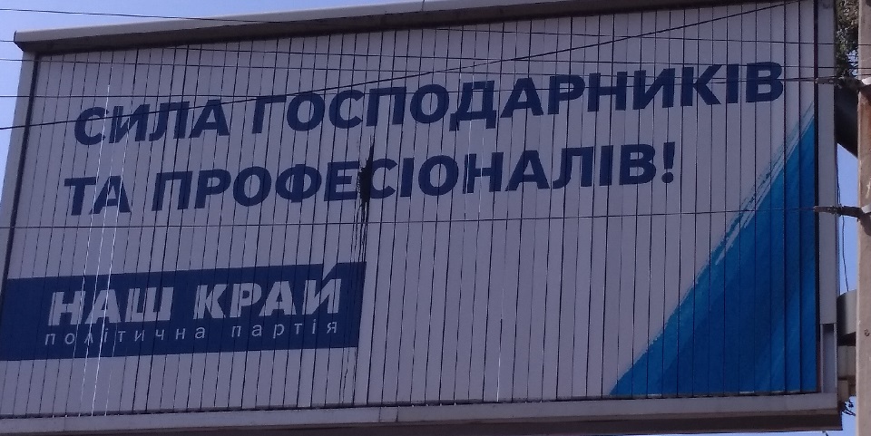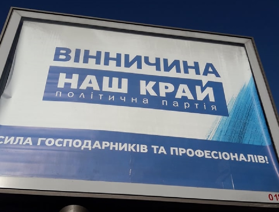 У різних районах Вінниці з’явилися білборди з політичною рекламою партії «Наш край» із гаслами «Вінниччина Наш край. Політична партія. Сила господарників та професіоналів» і «Сила господарників та професіоналів. Наш край. Політична партія».