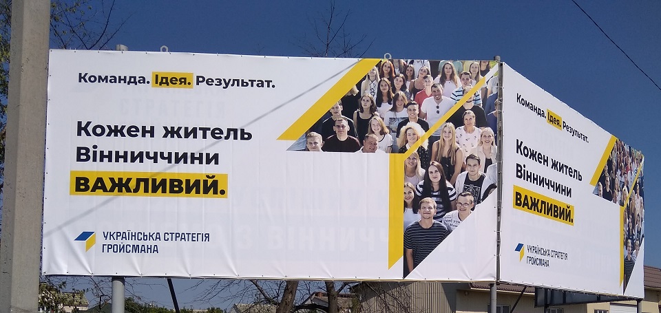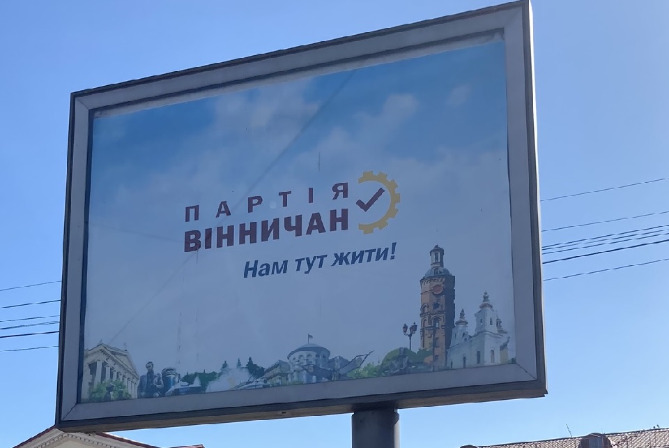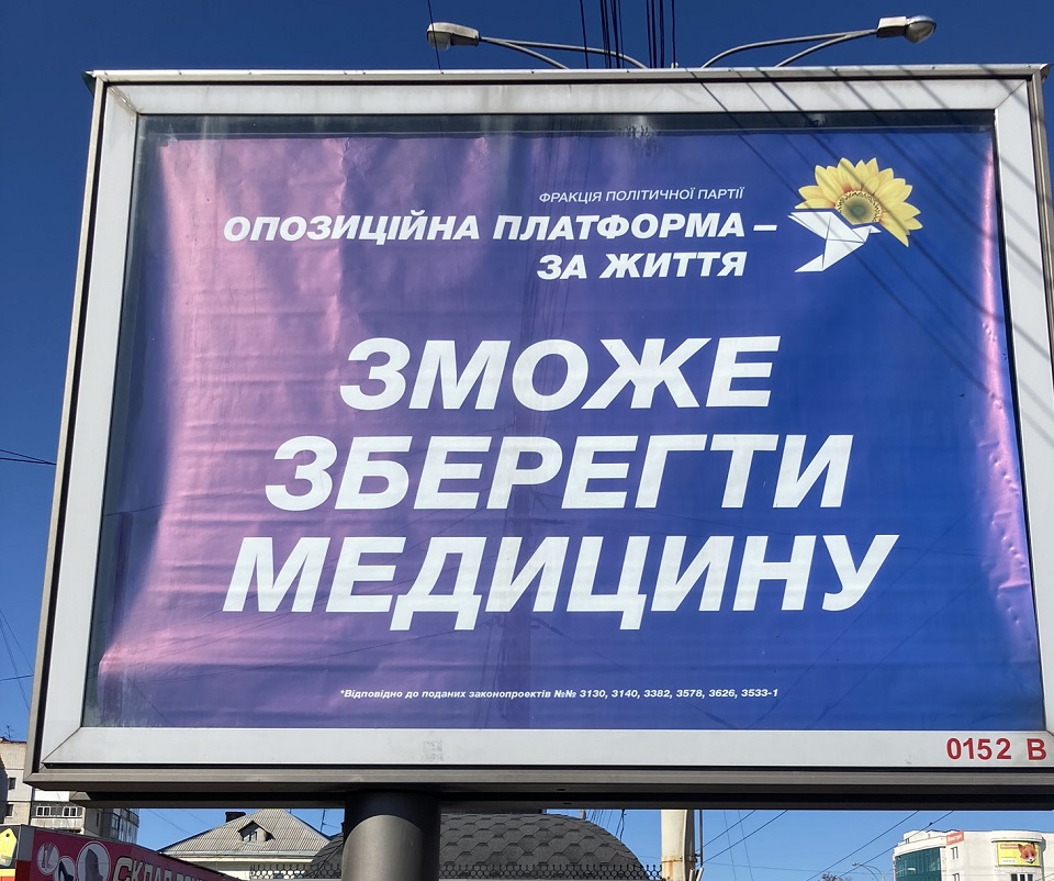 У Вінниці з’явилися рекламні білборди партії «Опозиційна платформа – За життя». Зовнішня реклама цієї політичної партії містить логотип партії, її назву зі згадкою парламентської фракції та гасла про те, що «Опозиційна платформа – За життя» зможе «відновити мир, відновити економіку, зберегти медицину».