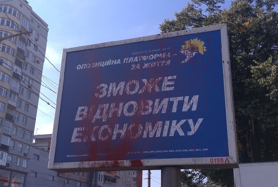 17 вересня на вулиці Пирогова спостерігачі ОПОРИ зафіксували білборд з написом: «Фракція політичної партії. Опозиційна платформа – За життя Зможе відновити економіку», облитий червоною фарбою.