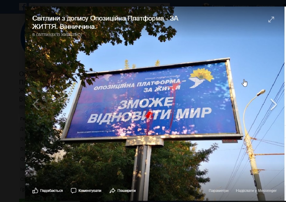 Також 15 вересня на сторінці у соціальній мережі Facebook «Опозиційна платформа – За життя. Вінниччина» було розміщено допис про те, що у Вінниці пошкодили білборд цієї політичної партії.