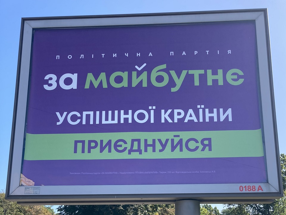 Оновила свою зовнішню рекламу на Вінниччині партія «За майбутнє». Так, у містах Вінниці, Хмільнику, Могилеві-Подільському з’явилися білборди із написом: «За майбутнє. Досвідчений лідер – сильна економіка. Ігор Палиця». У Вінниці, Гайсині та Хмільнику розміщено білборди із фото народного депутата України, очільника місцевого осередку партії Петра Юрчишина та написом: «За майбутнє. Ти – господар на своїй землі! Петро Юрчишин».