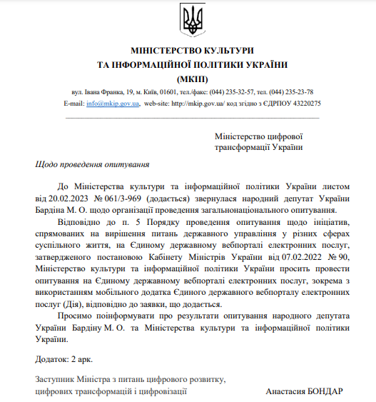 У відповіді на інформаційний запит вказано, що Мінкульт за зверненням нардепки він «Слуги народу» Марини Бардіної надіслав запит на проведення опитування 27 лютого. Отже, відповідно до вимог згаданої вище постанови Кабміну, це опитування мало з’явитись лише 27 березня, тобто аж за 19 днів після свята. Варто відзначити, що депутатка ще 20 лютого написала відповідного листа до Міністерства, яке тиждень його опрацьовувало. У разі оперативнішого опрацювання таке опитування могло б початися, наприклад, 21–22 березня.