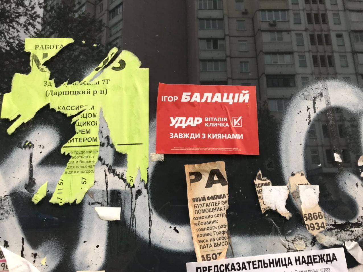 Від початку жовтня спостерігачі ОПОРИ в Києві фіксували агітаційні матеріали, які були розміщені з порушеннями вимог Виборчого кодексу України, Закону України “Про благоустрій населених пунктів” та рішення Київської міської ради про “Правила благоустрою міста Києва”.