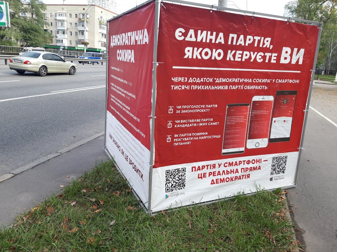 На перехресті проспекту Перемоги і вулиці Крамського ОПОРА зафіксувала три агітаційні куби від політичної партії “Демократична сокира”, що були розміщені з порушенням “Правил благоустрою міста Києва”, а саме на зеленій зоні.