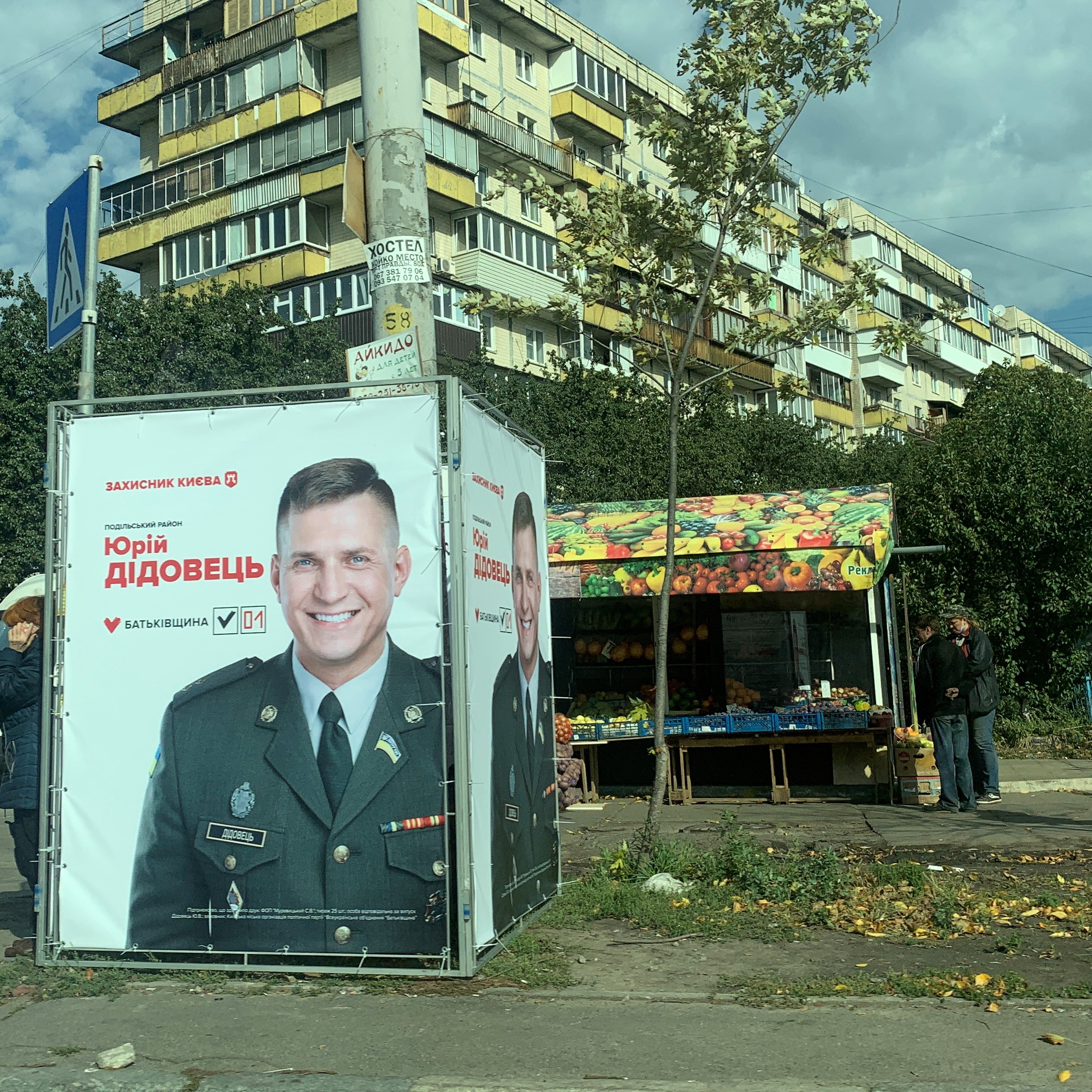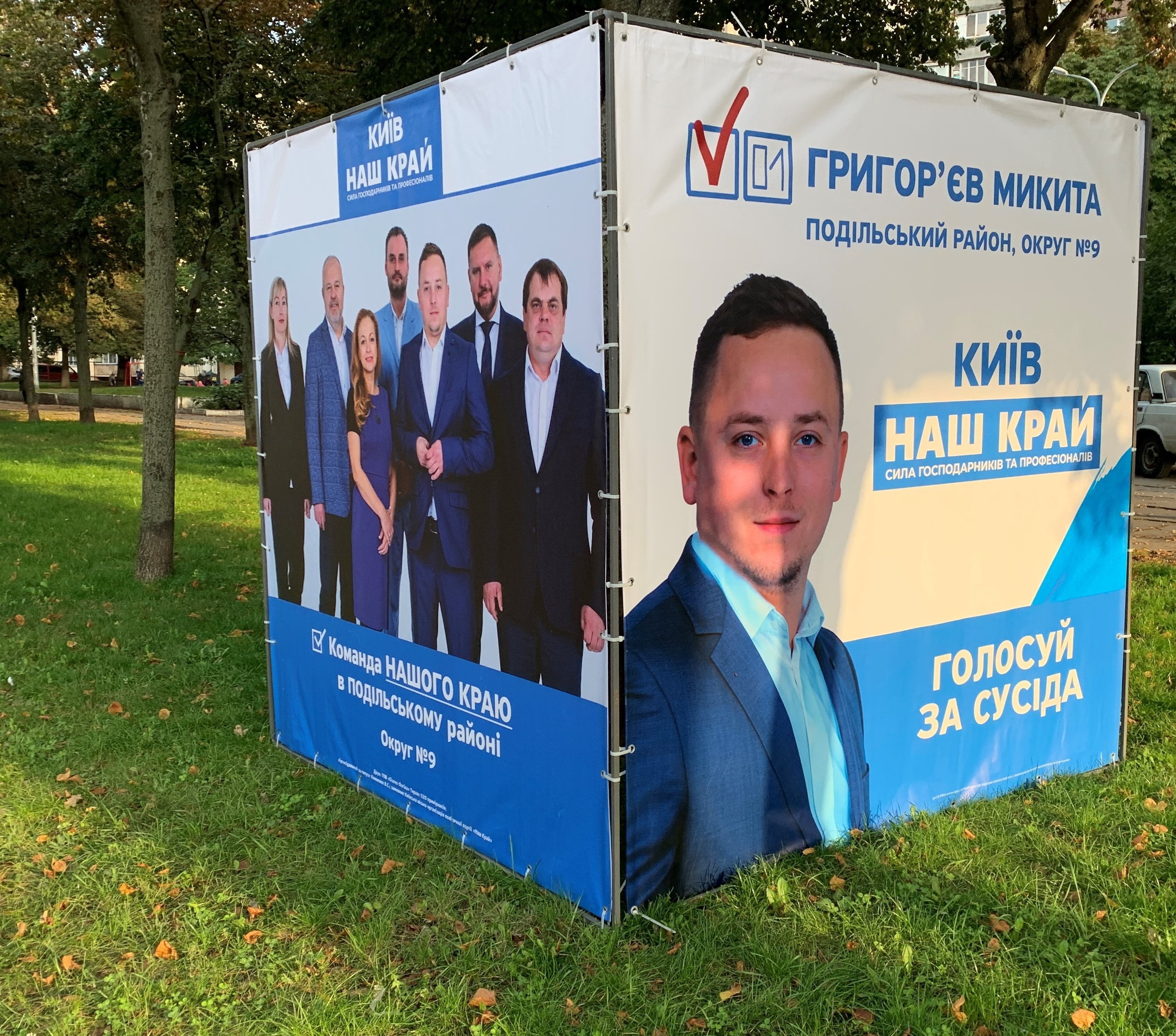 На зелених зонах Подільського району спостерігачі ОПОРИ фіксували агітаційні куби двох організацій політичних партій – ВО “Батьківщина” та “Наш край”. На кубі з логотипом ВО “Батьківщина” зображений кандидат в депутати Київської міської ради Юрій Дідовець та його короткий звіт про діяльність як депутата міськради за 2015 -2020 роки. Куб з політичною рекламою від партії “Наш Край” на своїх гранях містив зображення кандидата на посаду Київського міського голови Сергія Шахова та кандидата в депутати до Київради, що балотується в Подільському районі, Микити Григор’єва.