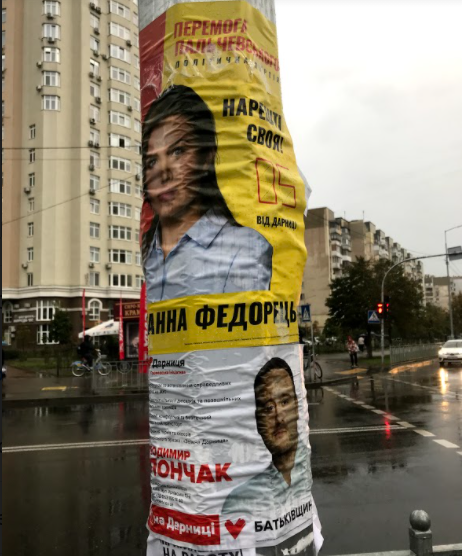На вулиці Драгоманова ОПОРА зафіксувала на електроопорах листівки кандидатки партії “Перемога Пальчевського” Анни Федорець та кандидата від ВО “Батьківщина” Володимира Слончака.