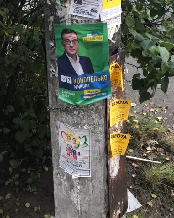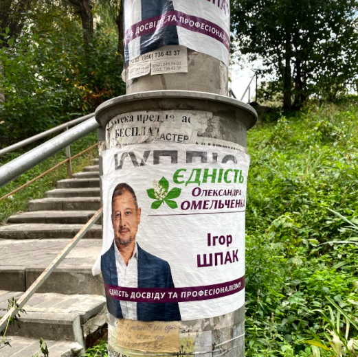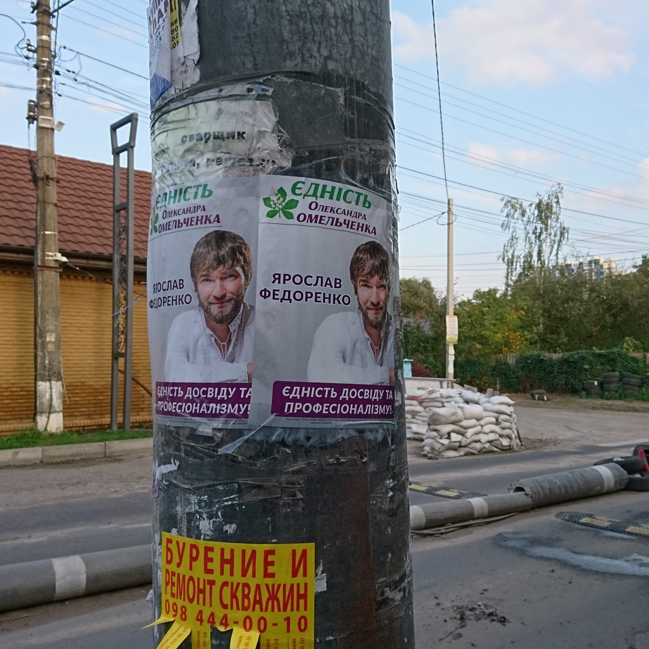 На одній із вулиць Дніпровського району ОПОРА зафіксувала агітаційні листівки кандидата в депутати за списками партії “Єдність” Ярослава Федоренка на електроопорі. На листівці містилось зображення кандидата на напис “Єдність досвіду та професіоналізму”.