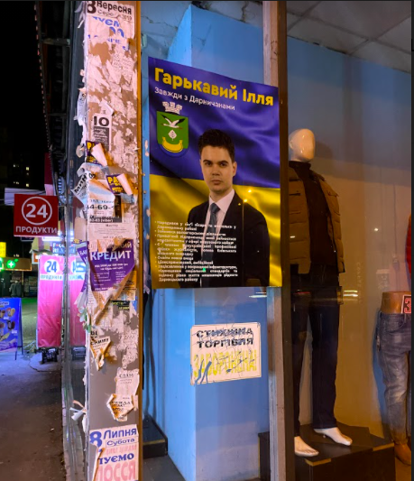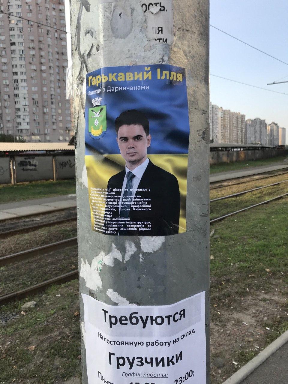 На деяких вулицях Дарницького району ОПОРА зафіксувала агітаційні постери кандидата в депутати за територіальним списком №2 політичної партії “Опозиційна платформа – За життя” Іллі Гарькавого. На постерах зображений кандидат та подано його коротку біографію. Утім символіки партії на цих плакатах немає. Дані про друк тираж та замовника на постерах відсутіні. Плакати кандидата були також на електроопорі на вулиці Петра Григоренка та на склі магазину “Джинси”, що на вулиці Миколи Бажана, 3в.