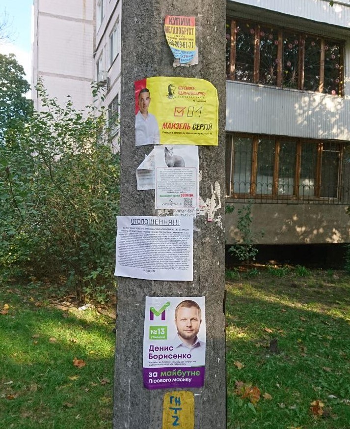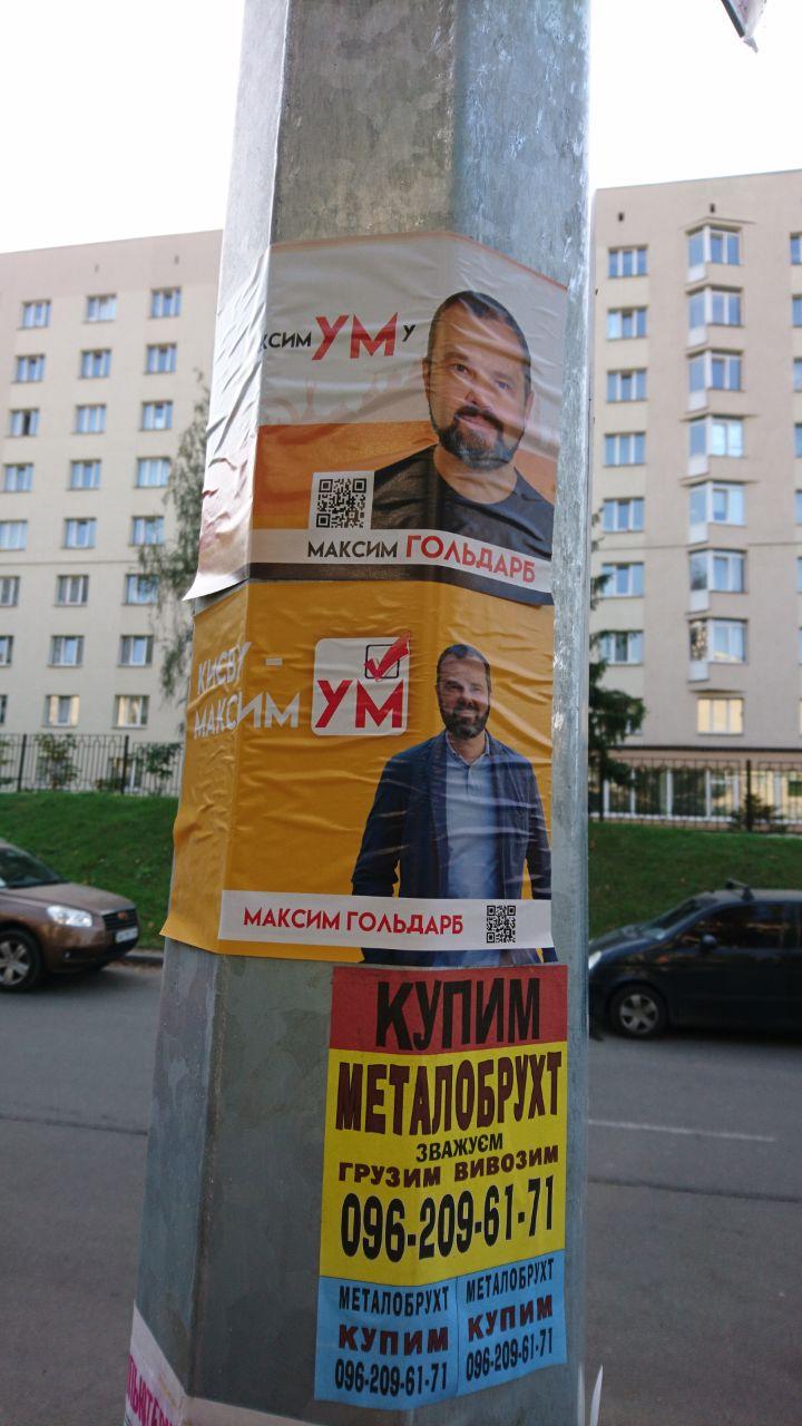 У Деснянському районі районі міста Києва, на вулиці Матеюка, на електроопорах виявили листівки представників трьох політичних сил: кандидатів в депутати Київради Дениса Борисенка (“За майбутнє”), Сергія Майзеля (“Перемога Пальчевського”), а також листівку без вихідних даних кандидата на посаду міського голови столиці Максима Гольдарба з написом “Києву – максимУм”.