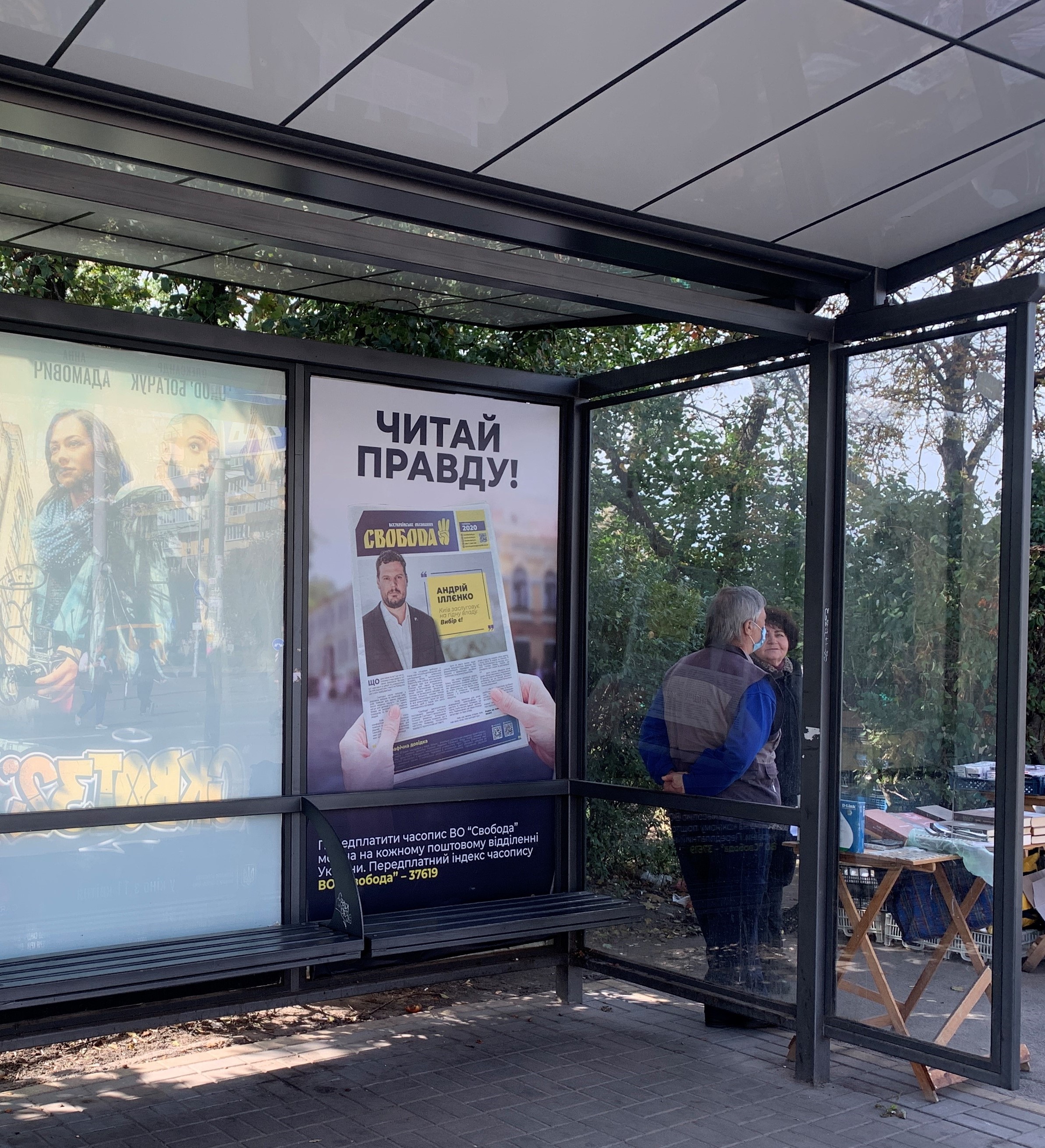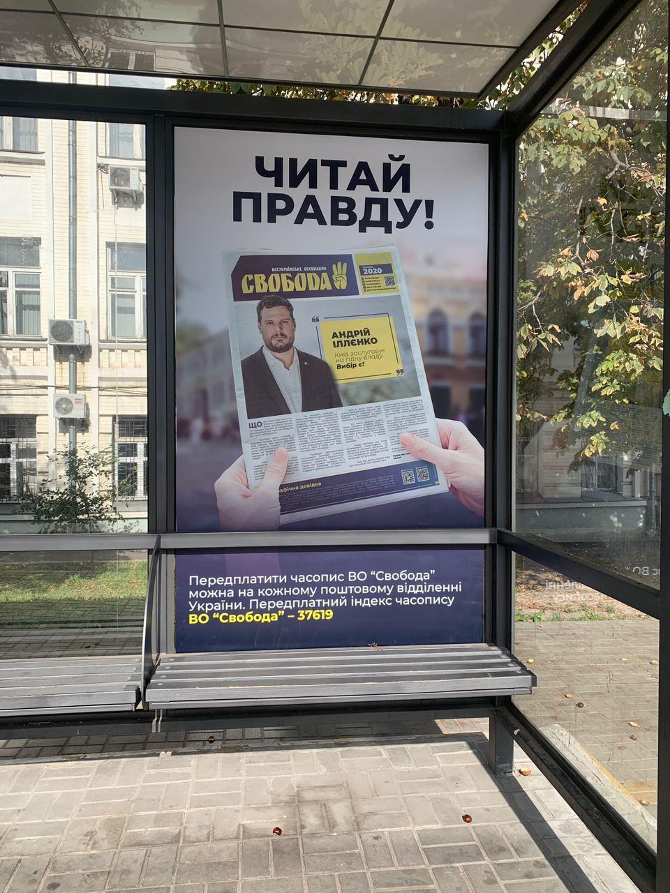 У Подільському районі міста Києва на зупинках громадського транспорту, що на вулиці Вишгородській та вулиці Світлицького, ОПОРА виявила ідентичні друковані матеріали політичної партії “Свобода” без вихідних даних. Плакат із рекламою політичної партії та її часопису містив такі написи: “Читай правду. Всеукраїнське об’єднання Свобода”. Андрій Іллєнко – Київ заслуговує на гідну владу. Вибір є!”. “Передплатити часопис ВО "Свобода" можна на кожному поштовому відділенні України. Передплатний індекс часопису ВО "Свобода” – 37619”, – зазначено внизу листівки.